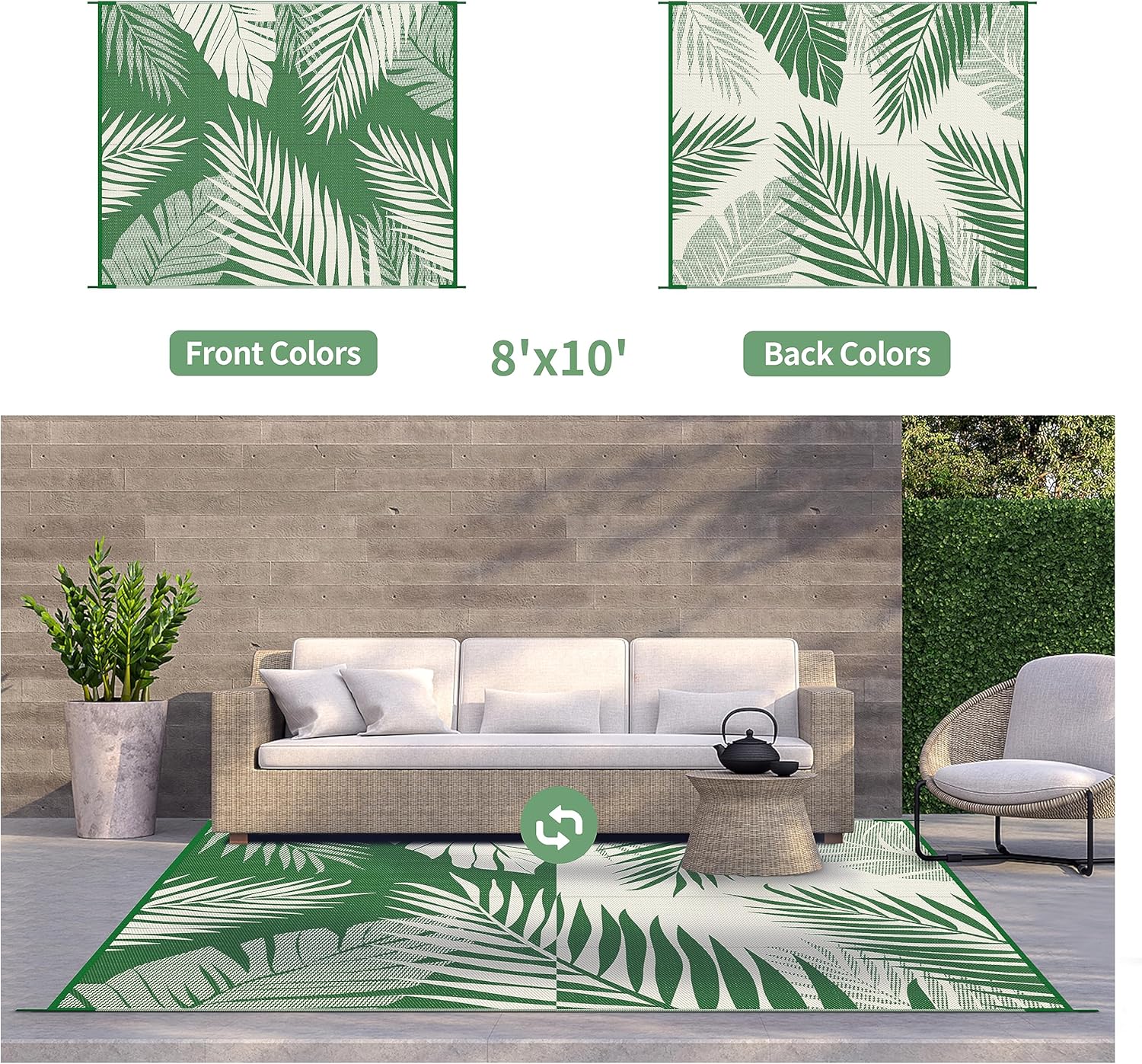 - 【PALM LEAF DESIGN & TWO-SIDED PATTERN】GENIMO reversible outdoor rug is designed with a double-sided pattern, completing the unique layout of multiple palm leaves. The two shades of dark green and white achieve the ultimate fusion. Either side can blend perfectly with nature and look very full and comfortable.