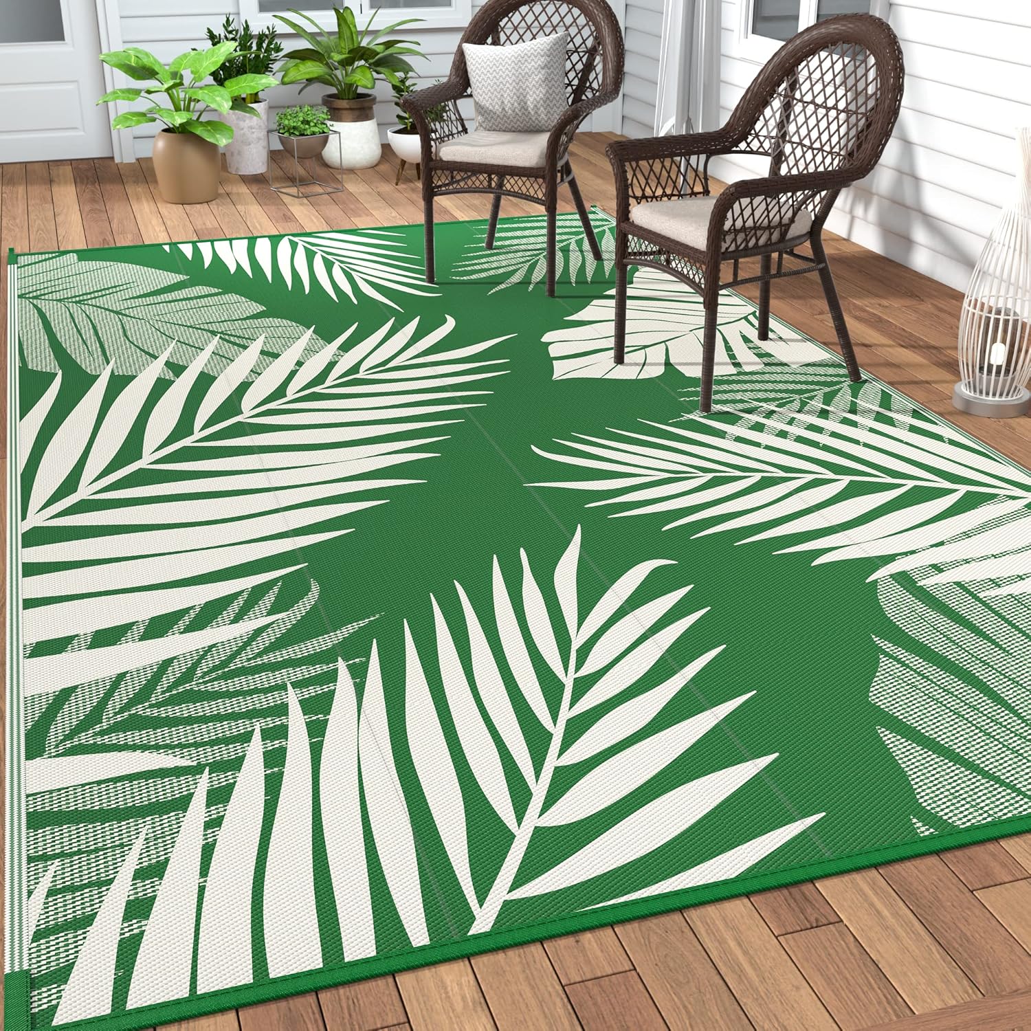 - Palm Leaf Design & Double-Sided Pattern: GENIMO reversible fall outdoor rug is designed with a double-sided pattern, completing the unique layout of multiple palm leaves. The 2 shades of green and white achieve the ultimate fusion. Either side can blend perfectly with nature and look very full and comfortable, making it a versatile piece for fall decor