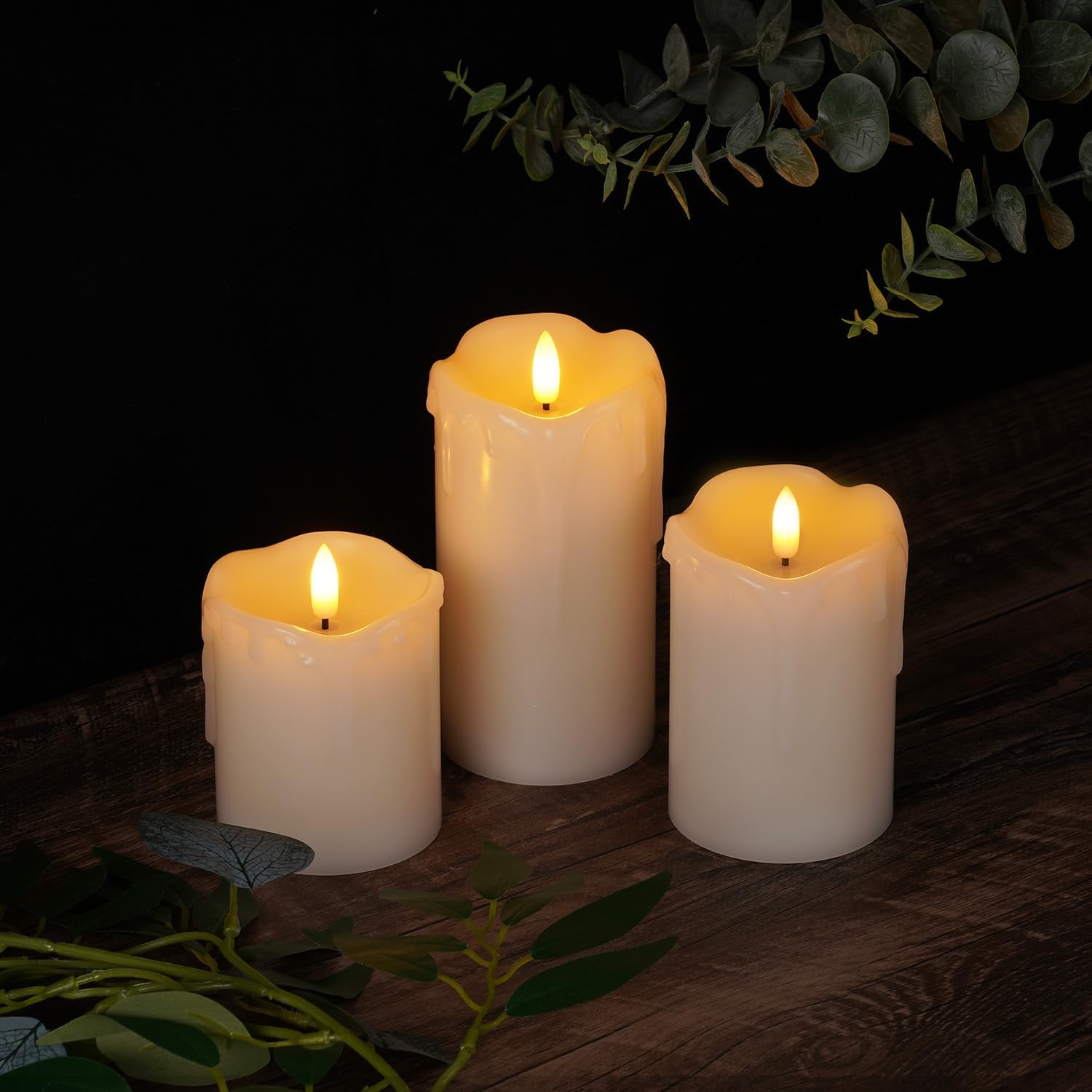 Homemory Dripping Wax Flameless LED Pillar Candles, Battery Operated with Remote Control and Timer, Set of 3, 5" H x 4" W x 6" D