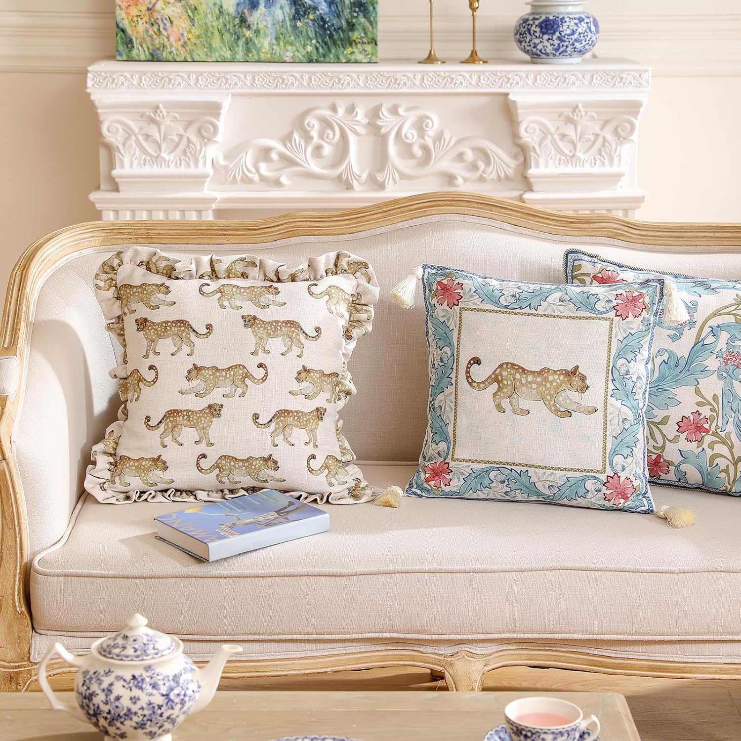 patdrea Designer Throw Pillow Covers for Couch,Vintage French Linen Pillows Cover with Cheetah Pattern and Luxury Pendant,Fall Farmhouse Decorative Pillowcases for Bed Living Room Outdoor Set of 4