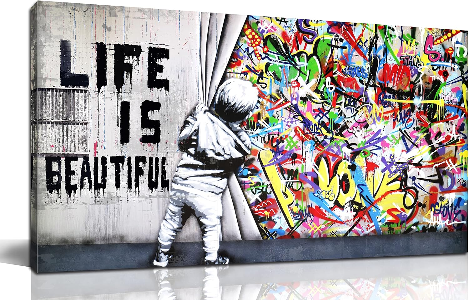 - 【HI-Q MATERIAL】 High quality, HD prints on premium canvas, waterproof canvas, UV resistant, fading resistant indoor. Colorful banksy wall art graffiti canvas wall art large wall decor for living room