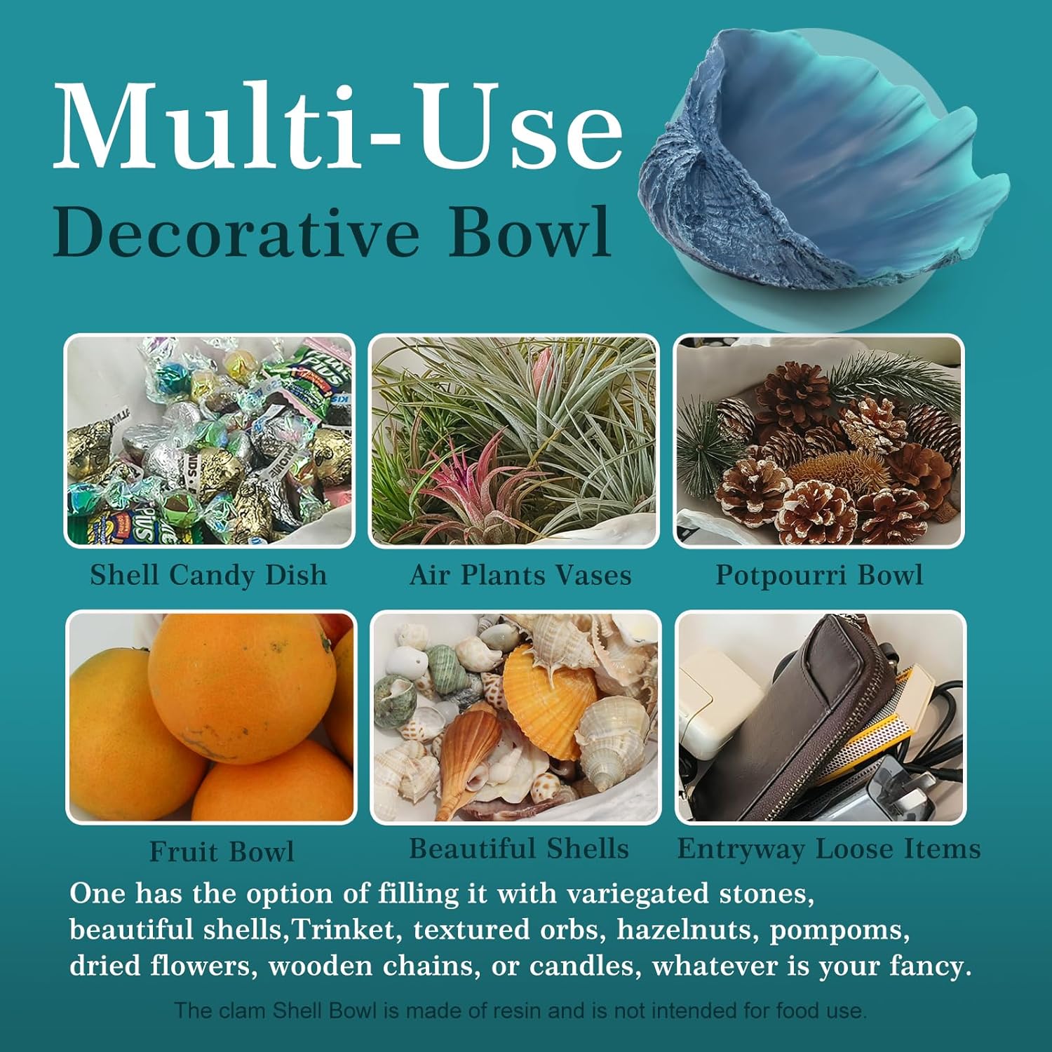 - 【Size】This Caribbean Blue Seashell decorative bowls made from 100% solid resin, -3.6" tall, 10.23" wide and 8.6" deep approximately. Clamshell decorative bowls Sufficient for home Bathroom Shelf,Room Console,Coffee table,Office Desk,Window Edges and a perfect idea for beach house decor,occasions for beach themed parties or weddings