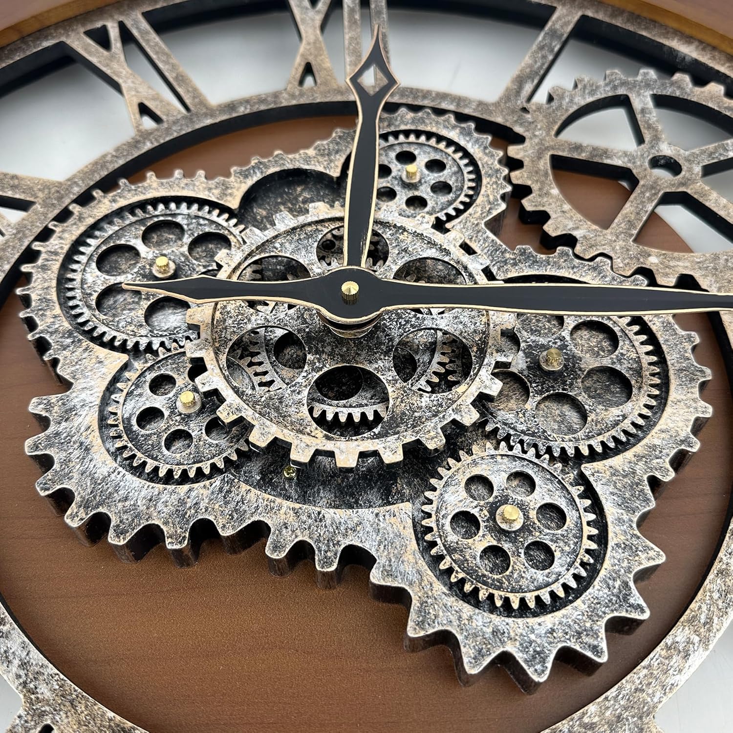 - 【Real Moving Gear Clock】All gears for the wall clock are real moving! Design with rustic bronze-color and industrial style. An creative combination of four gears for a retro look, has a very exquisite decorative effect makes the wall clock become a chic art works. The large wall clock crafted of nature wood & MDF. Big roman numeral numbers and wood rustic moving gears perfect for any room decor.