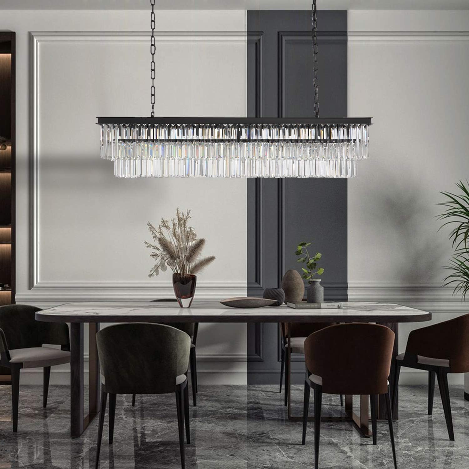 Rectangle Crystal Chandelier Black Modern Linear Chandelier Contemporary Pendant Light Fixture 8-Light Hanging Ceiling Light for Dining Room Living Room Kitchen Bedroom Foyer 47''