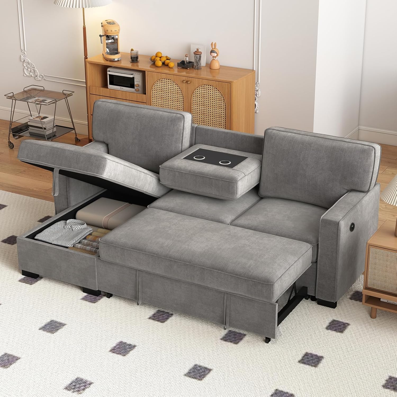 - USB Port & Cup Holder: This gray convertible sleeper sofa bed 1 USB ports and type C port for charging electronic devices. The hidden two cup holders on the middle of the backrest hold your drinks to maximize your daily needs. We are committed to integrating a variety of humanized designs to create more convenience for your life