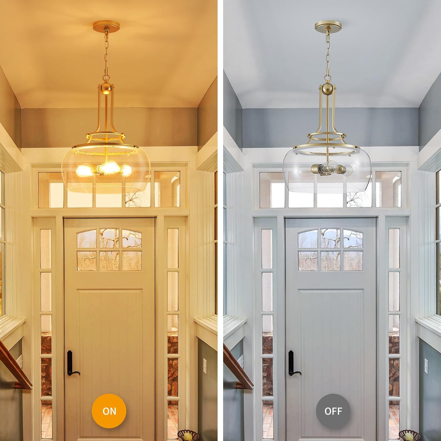 WUZUPS Chandelier Rustic Farmhouse Industrial Round Ceiling Pendant LED Light Fixture Clear Seeded Glass Shade for Dining Room Kitchen Island Foyer Entryway, H 20.9" x W 15.9", Gold