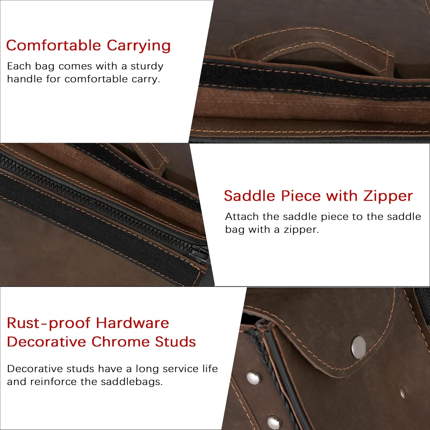 - [Fashion Appearance and Flap Design] - Thin braiding is built along edges and makes the saddlebags more fashion. The brown saddle bags will give your motorcycle a new look while also greatly expand practicality of bike. Flap design and strong stitching make sure that the saddle bags will not lose luggage when riding fast on bumpy roads. Flap design helps prevent dust or rain from entering and keep items clean and dry.