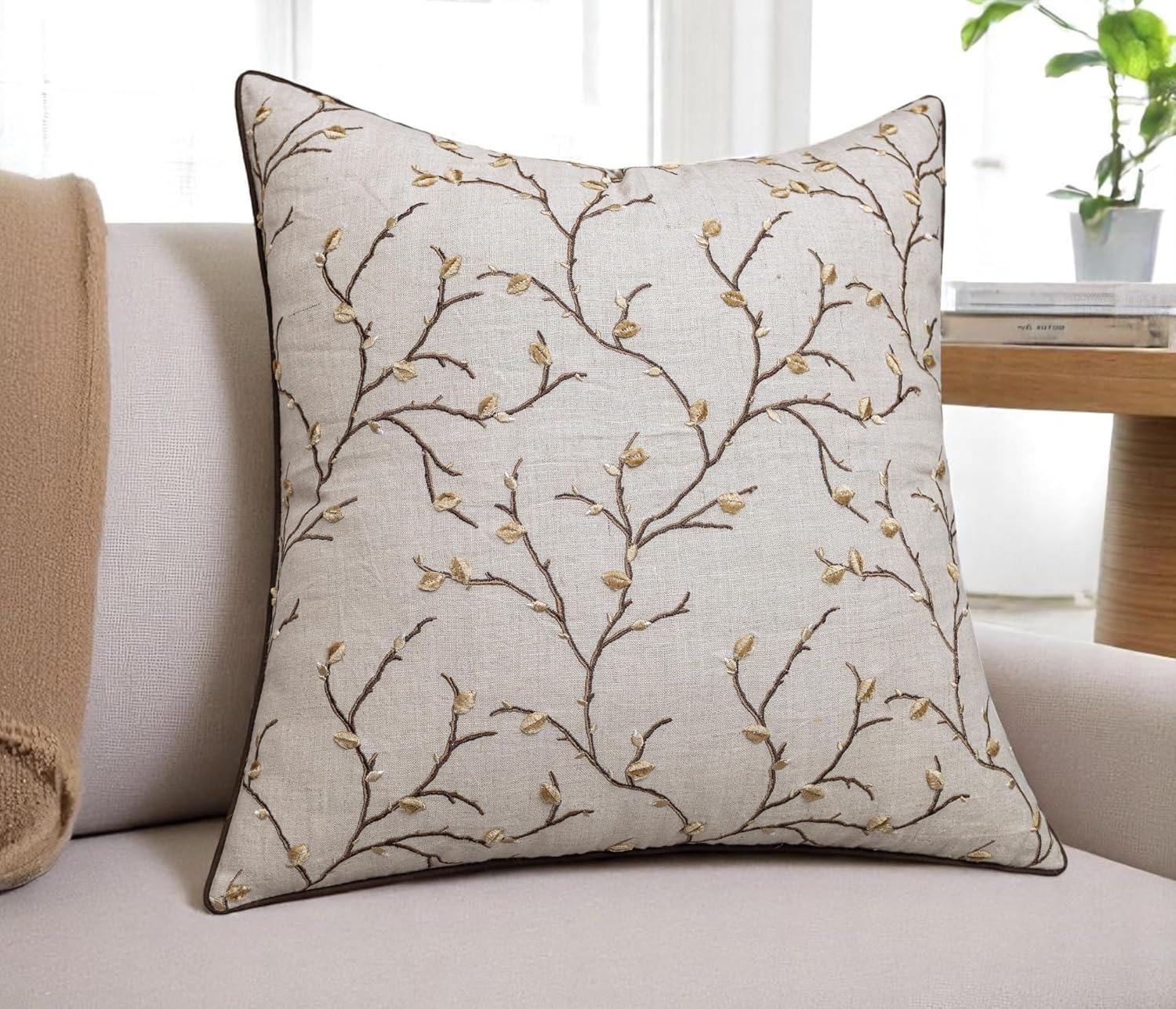 VAGMINE Embroidered Pussy Willow Throw Pillow Cover - 20x20 Inches Square - 100% Linen Natural Throw Pillowcase - Elegant Neutral Floral Design - Minimalist Rustic Home Accent for Sofa, Bed, Lounge