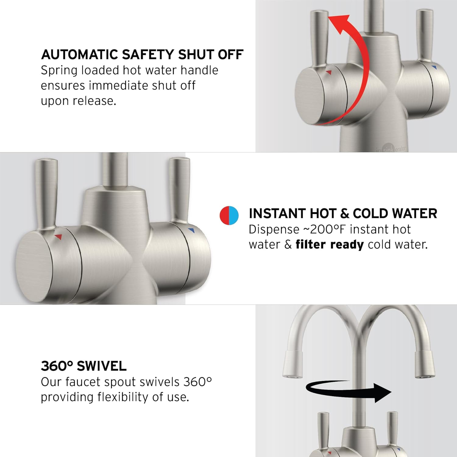 - ON-DEMAND, NEAR-BOILING WATER: Instant hot water (approximately 200 degrees F) right next to the main kitchen faucet when you need it, for cooking, cleaning, and more; a time, space, and energy saver that lets you get on with more important things in life