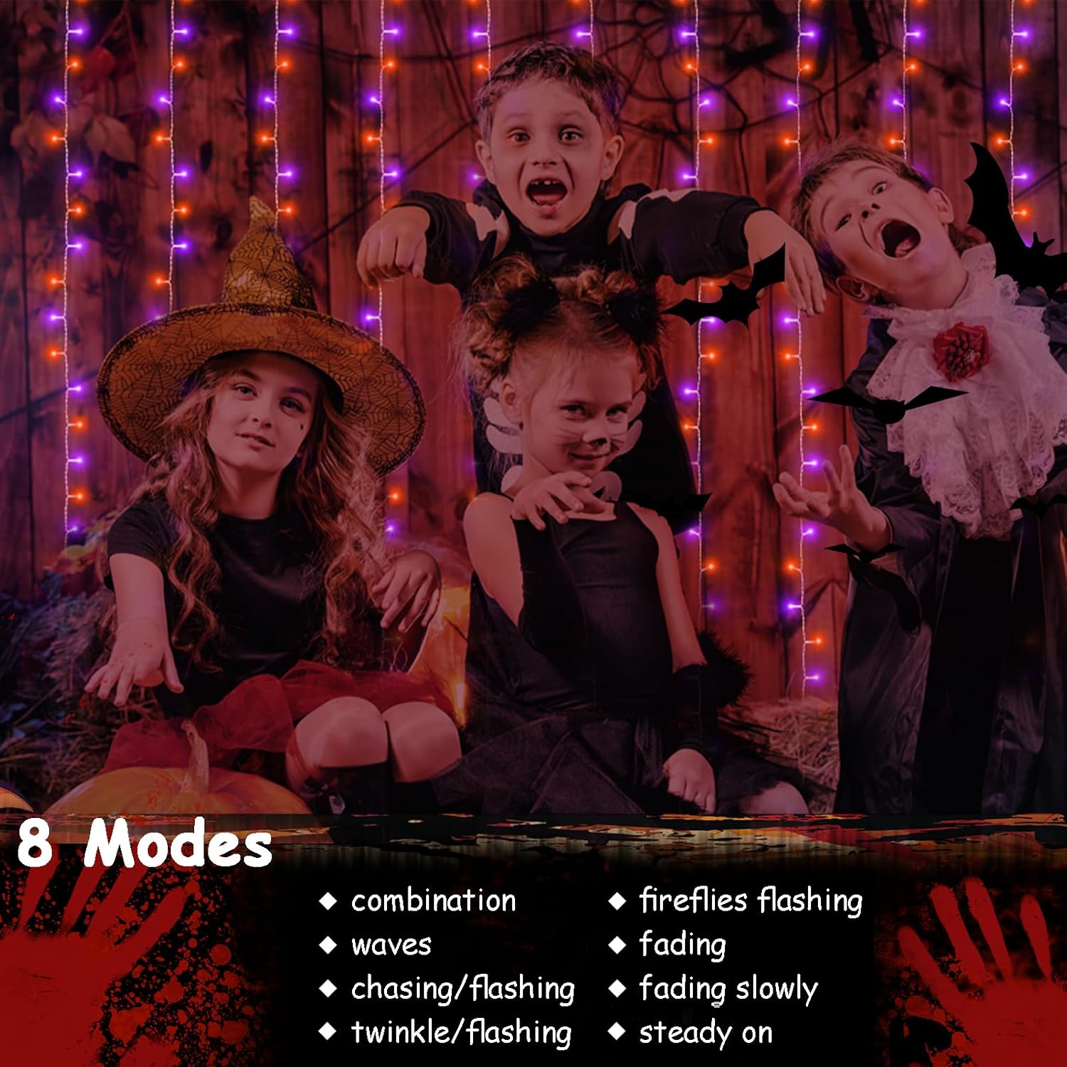 - Purple & Orange Halloween Lights: 300 LED string curtain lights, 9.8ft x 9.8ft hanging lights with remote control for Halloween decor