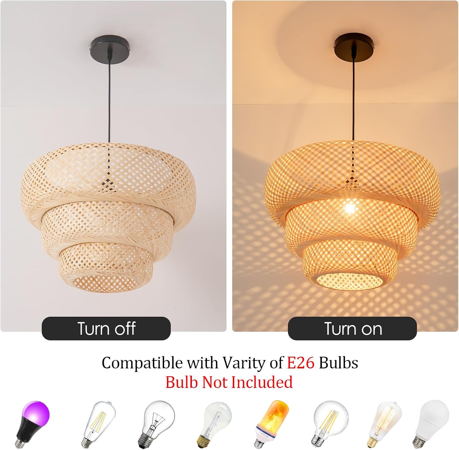 - 【 Easy installation】Bamboo and Rattan pendant light all mounting hardwares are included and installation process is simple, which just need 5 minutures. open the package when installing the lampshade please gently open the folding lampshade, mounted to the metal bracket, connect to the power supply, press the switch button to turn on or off the light.If you need to find seller support