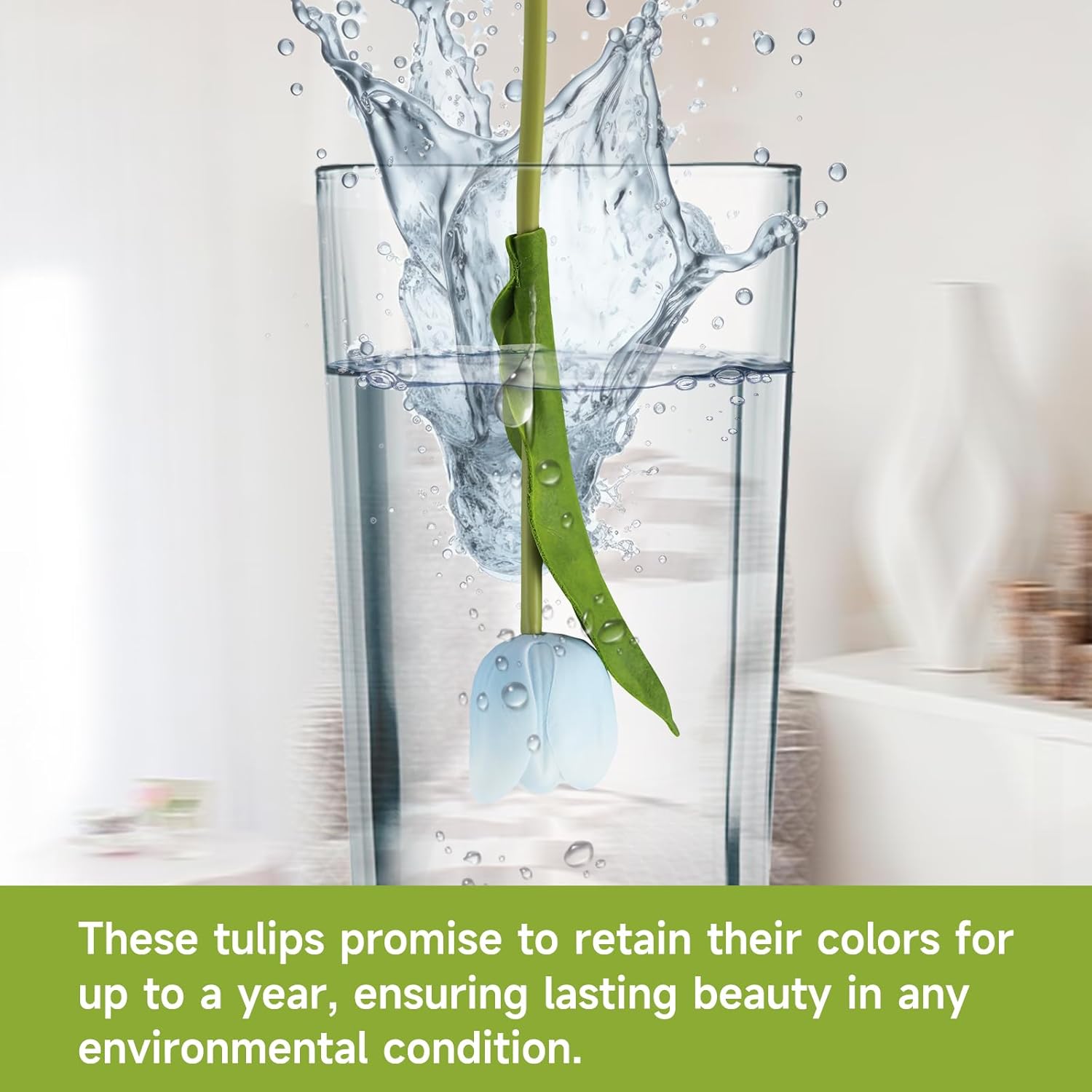 - What sets our tulips apart is their longevity. With the addition of imported antioxidant and anti-ultraviolet agents, these tulips promise to retain their colors for up to a year, ensuring lasting beauty in any environmental condition. Note: Artificial flowers without UV inhibitors will turn yellow within 2 weeks under sunlight, and those treated with poor-quality oxidants will have a smell similar to cow dung or burning plastic , and they can only maintain their color for about a month.
