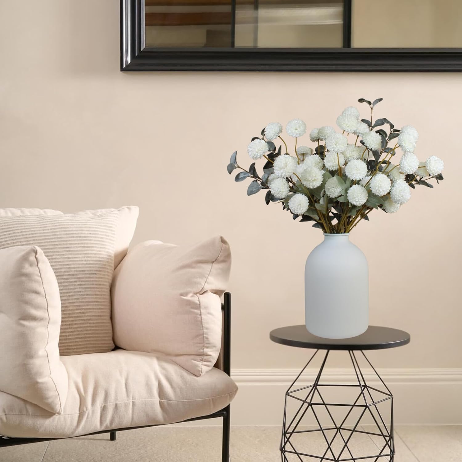 - White Faux Flowers For Vase that look real - This white flower bouquet boasts faux white flowers that mimic real looking blooms, from mum flowers ball artificial to the delicate silk flower white. Paired with eucalyptus stems, this arrangement promises longevity and beauty in any setting. Ideal for floral centerpieces for tables or as stems for vases for decoration, they remain fresh looking, making them a sustainable choice for floral decor.