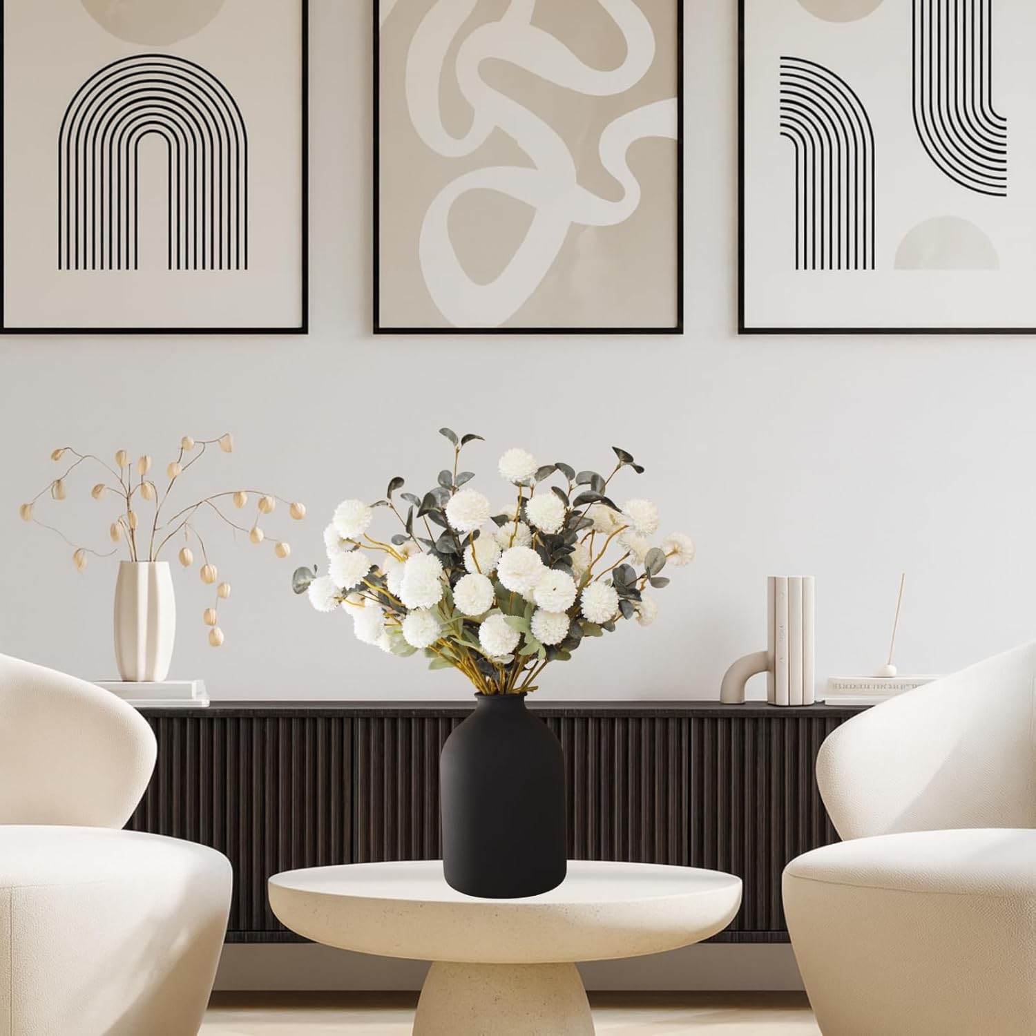 White Faux Flowers for Vase - Kiku 10 Stems & Eucalyptus, Fake Flowers Stems for Pottery Vase, Realistic Artificial Flowers, Pom Pom Balls for Aesthetic Room Decor, Floral Arrangements Centerpiece