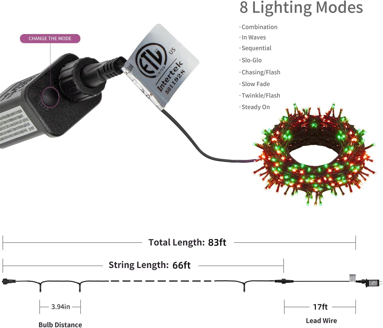 - 66ft Christmas Decorations string lights: With 200 Red & Green individual LED bulbs. Each green wire lights has end-to-end connection, you can connect up to 4 sets together to illuminate a wider range. Fit different occasions, moods, feelings, holidays, festivals, anniversaries, etc