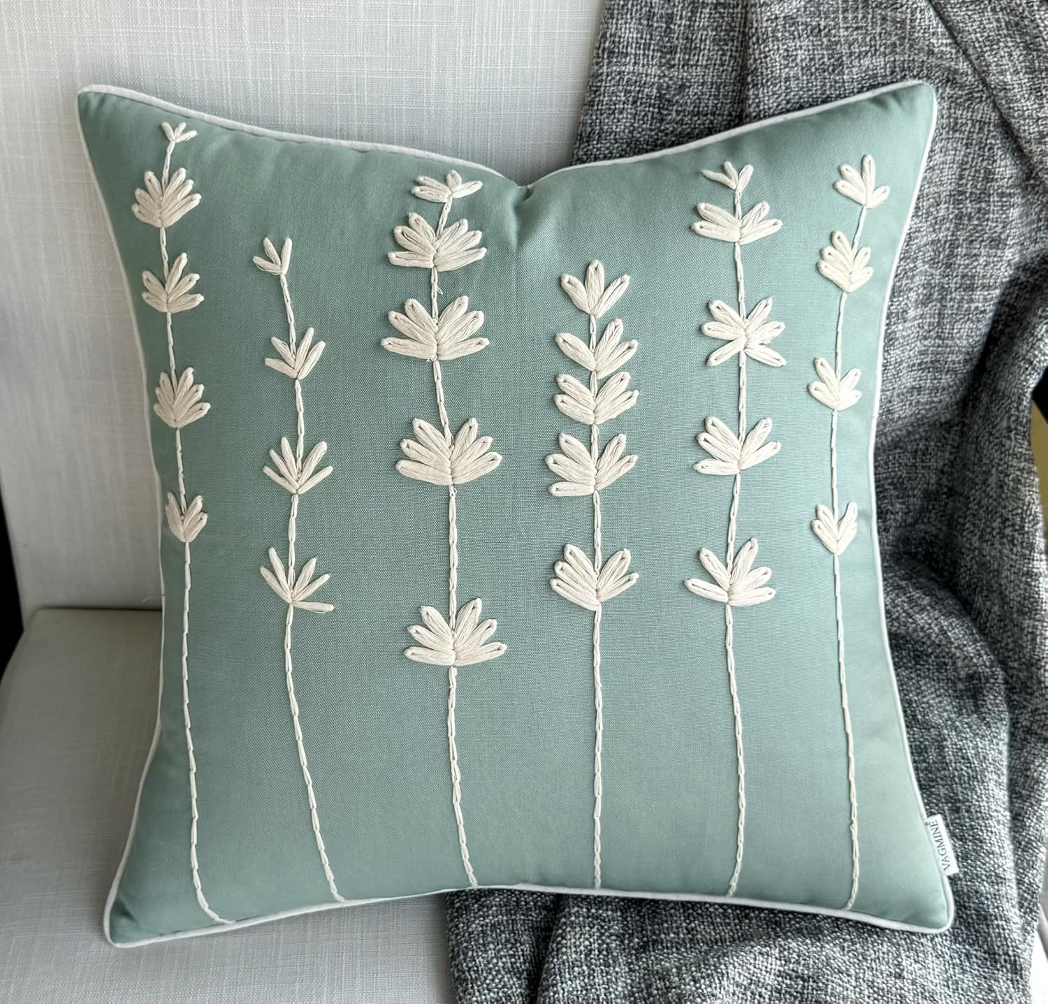 VAGMINE Hand Embroidered Daisy Accent Throw Pillow Cover - 20x20 Inches Square - 100% Cotton Light Teal Decorative Cushion Cover for Couch, Sofa, Bed - Textured Embroidery - Elegant Floral Home Décor