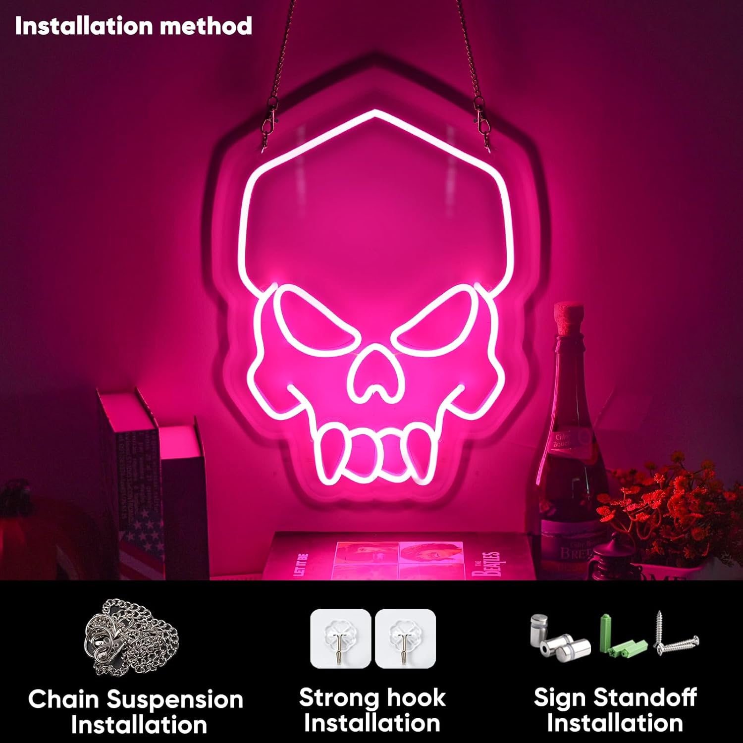 Dimmable Skull Neon Sign,Halloween Pink Neon Sign Light for Wall Decor, Skeleton LED Neon Sign for Beer Bar Bedroom Art,Skull Head Neon Lights Suitable for Computer Room, 5V USB Power 15.75 * 11.8in