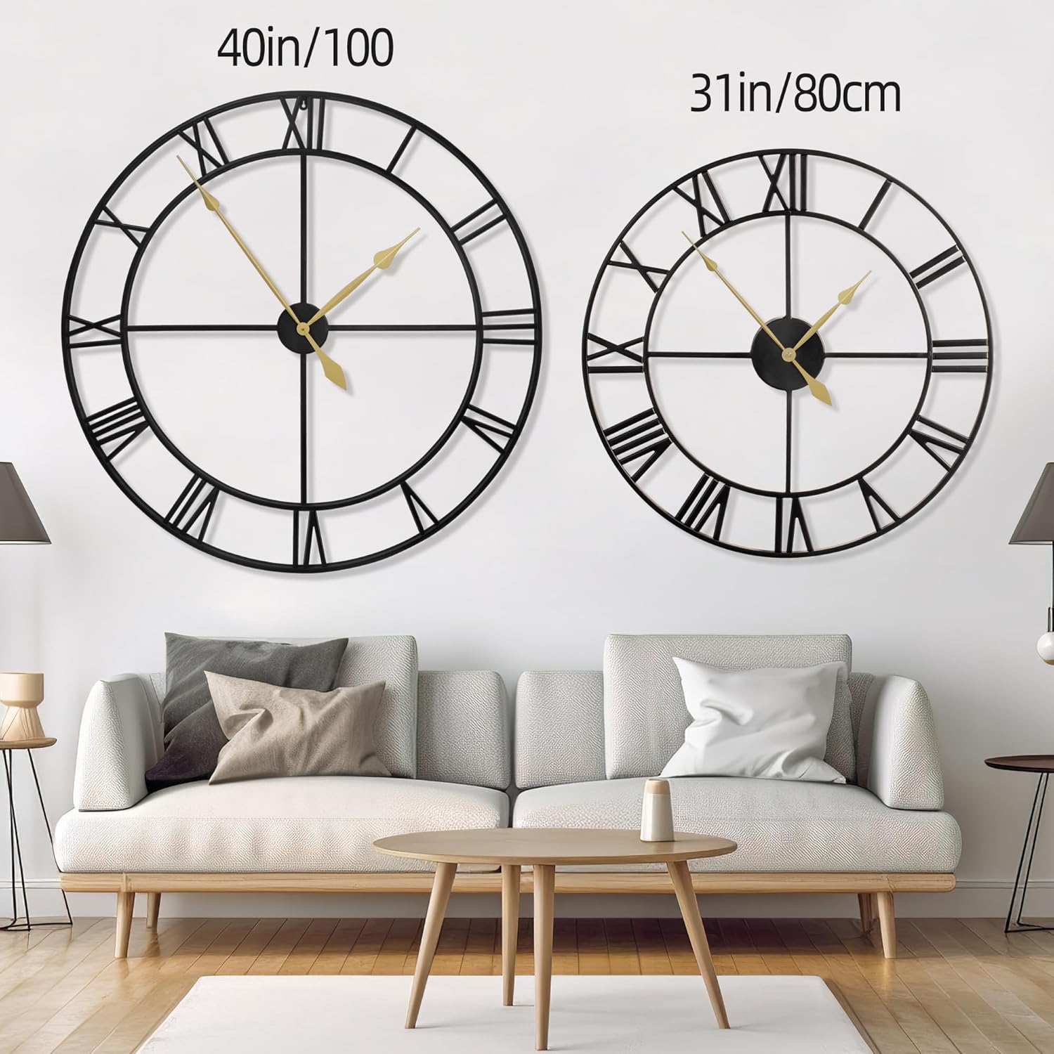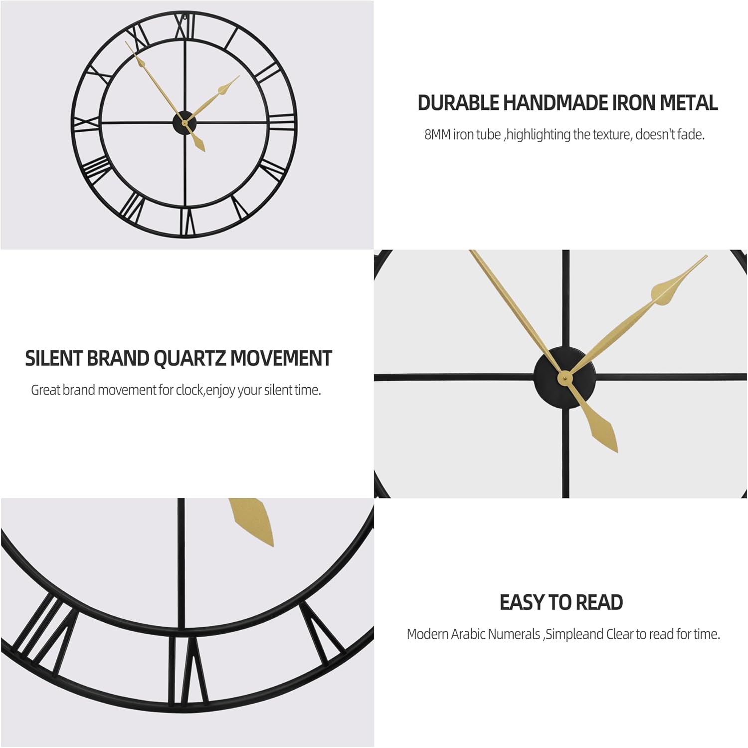 - [Modern Clock] The large metal clock has a hollowed-out retro design. The strength and retro appearance of the Roman wall clock are ensured by the use of high-quality materials in the handcrafted, solid iron frame.