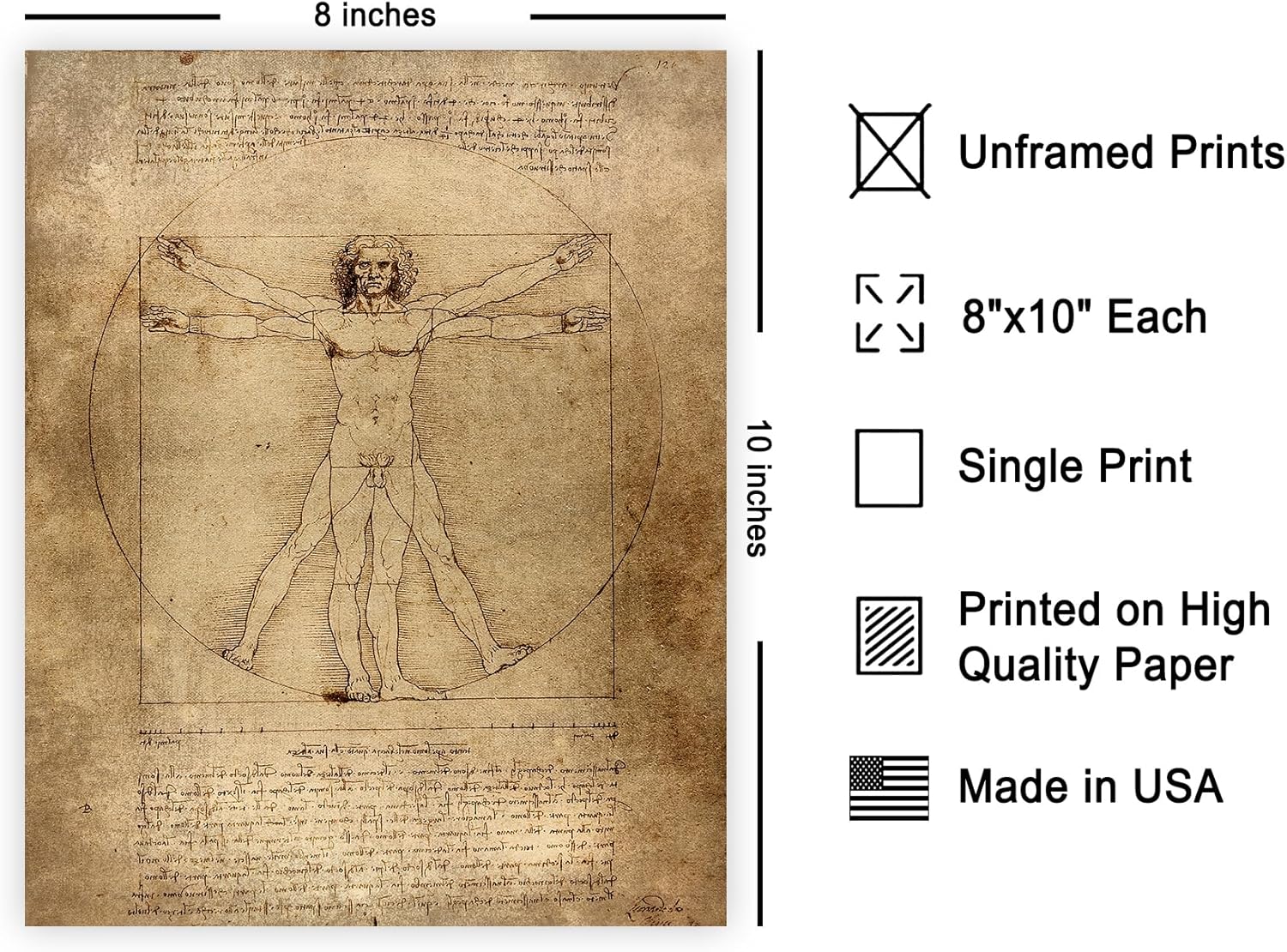 Poster Master Vintage Leonardo Da Vinci Poster - Retro Vitruvian Man Print - Drawing Art - Renaissance Art - Gift for Men & Women - Decor for Living Room, Bedroom or Office - 8x10 UNFRAMED Wall Art