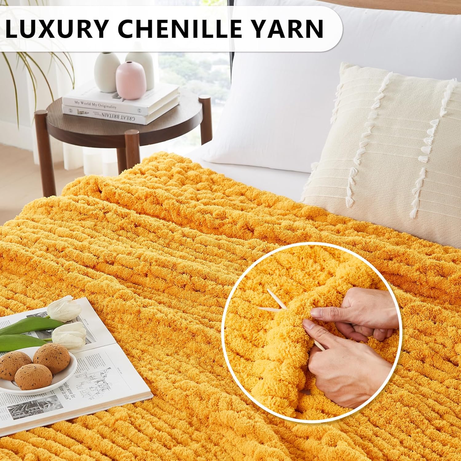 L'AGRATY Chunky Knit Blanket Throw - Soft Chunky Throw Blanket 60x80: 100% Hand Kintted Chenile Crochet Throw Blanket for Couch - Large Cable Knit Chunky Blanket for Home Decor(Mustard Yellow)