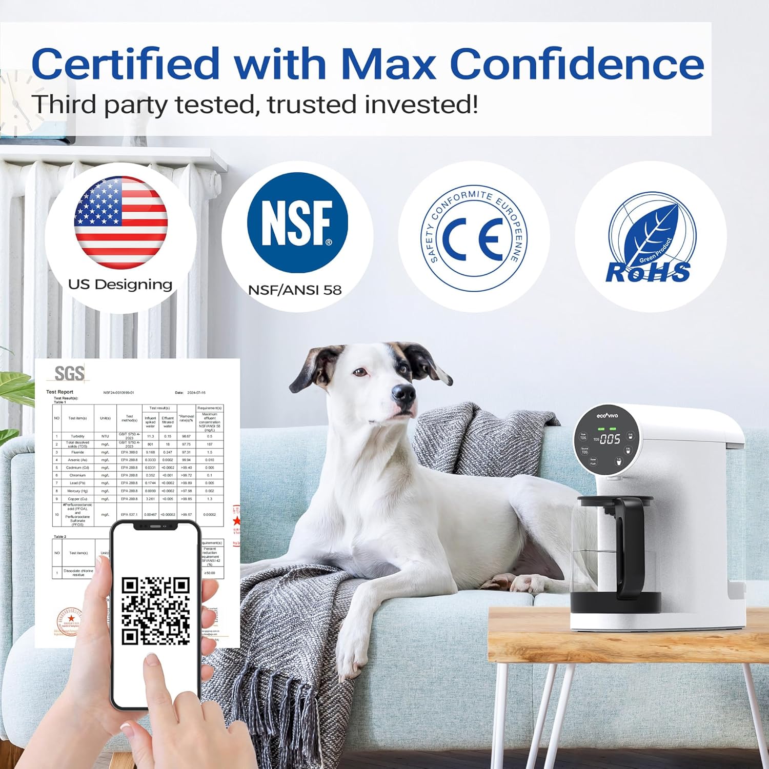 - SGS Tested Composite & Cycling Filtration: Meet NSF/ANSI 58 standards, test by SGS, the Ecoviva RO system features advanced composite filtration and a 0.0001μm RO membrane. Its cycling filtration enhances protection, while the coconut shell activated carbon post-filter effectively removes chlorine, delivering fresher, clearer water