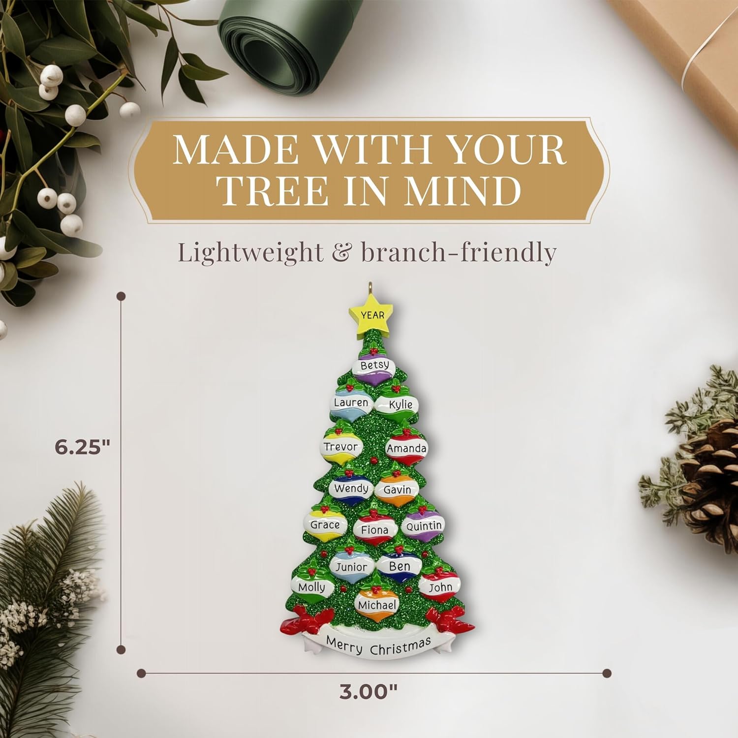 - ππππ§-π₯ππππ¬ ππ’πππππ¬π¦: Each ornament arrives beautifully wrapped! Add a personal touch with our decorated Christmas tree with names custom keepsake