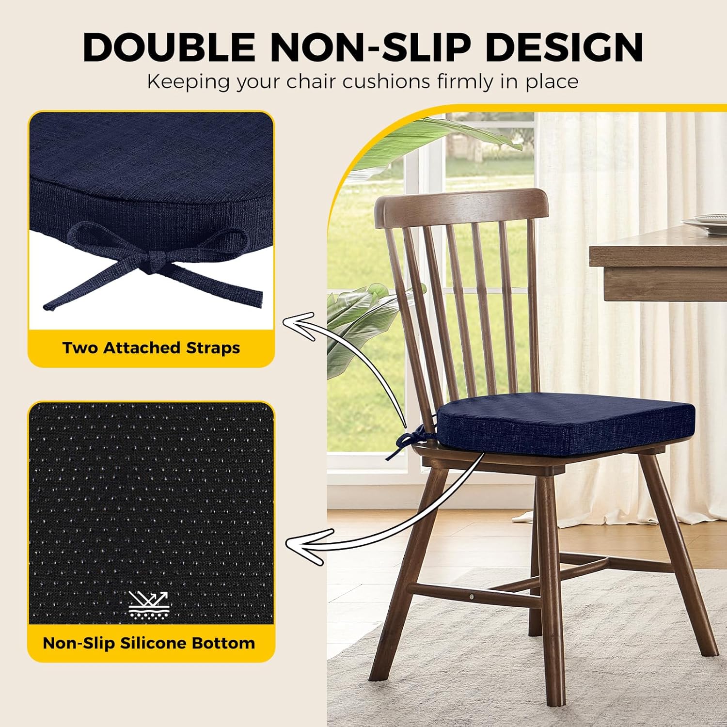 - Stay in Place: Attached ties and non-slip silicone bottom can double keep the seat cushion in place absolutely to prevent it from sliding. You don't need to adjust the dining chair cushions many times and just concentrate on enjoying your life