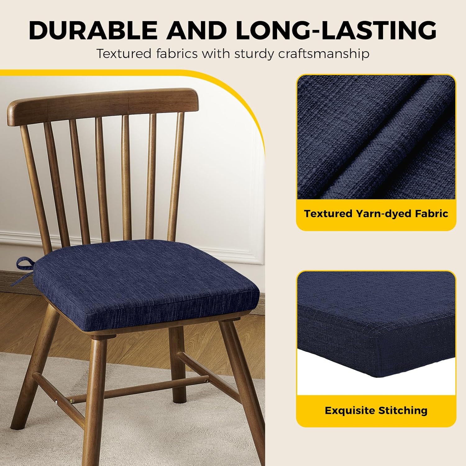 downluxe Indoor Chair Cushions for Dining Chairs, Soft and Comfortable Textured Foam Kitchen Chair Pads with Ties and Non-Slip Backing, 16" x 16" x 2", Navy, 2 Pack