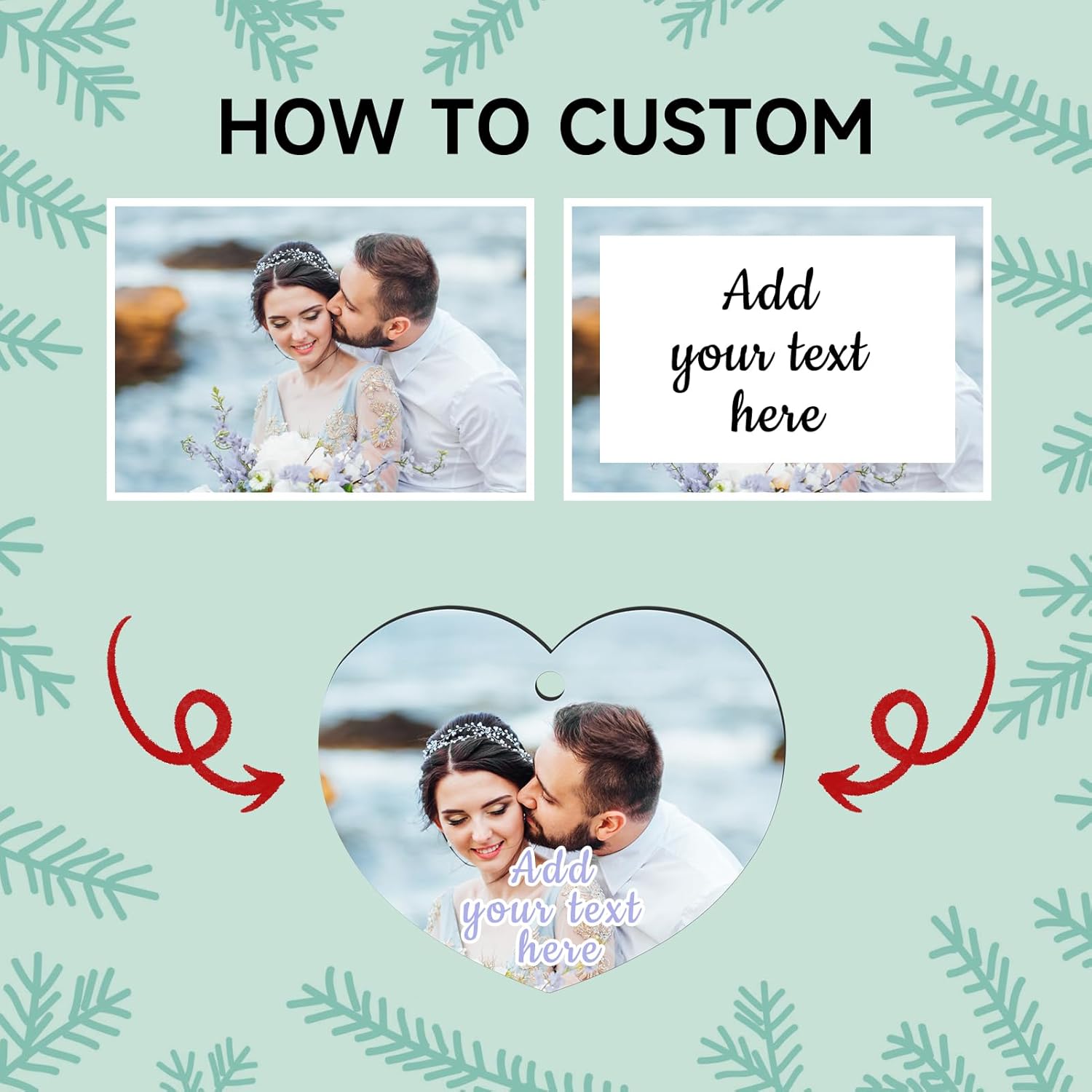 - 【Custom Photo Text Christmas Ornaments】Click on the " Customize Now " button to design your own Christmas ornament special with desired Photo, Picture, Logo, Text. Simply upload any photo, fit by the corners. Choose your font color, fill in the optional blank with your text. Our designers will do the rest.