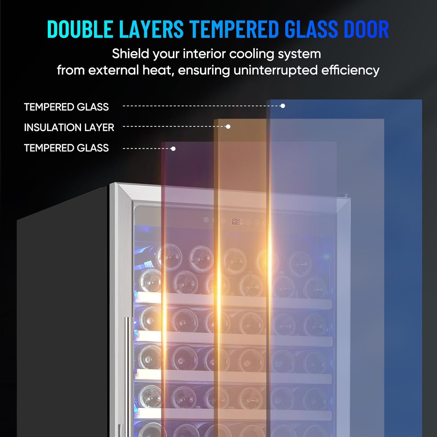 - 【Double-Layer Glass Door and Safety Lock Design】The wine cabinet features a double-layer tempered glass door, presenting a visually appealing wine display. This design effectively insulates against external temperature fluctuations, ensuring wines remain in optimal storage conditions. The safety lock adds an extra layer of security for your valuable collection.