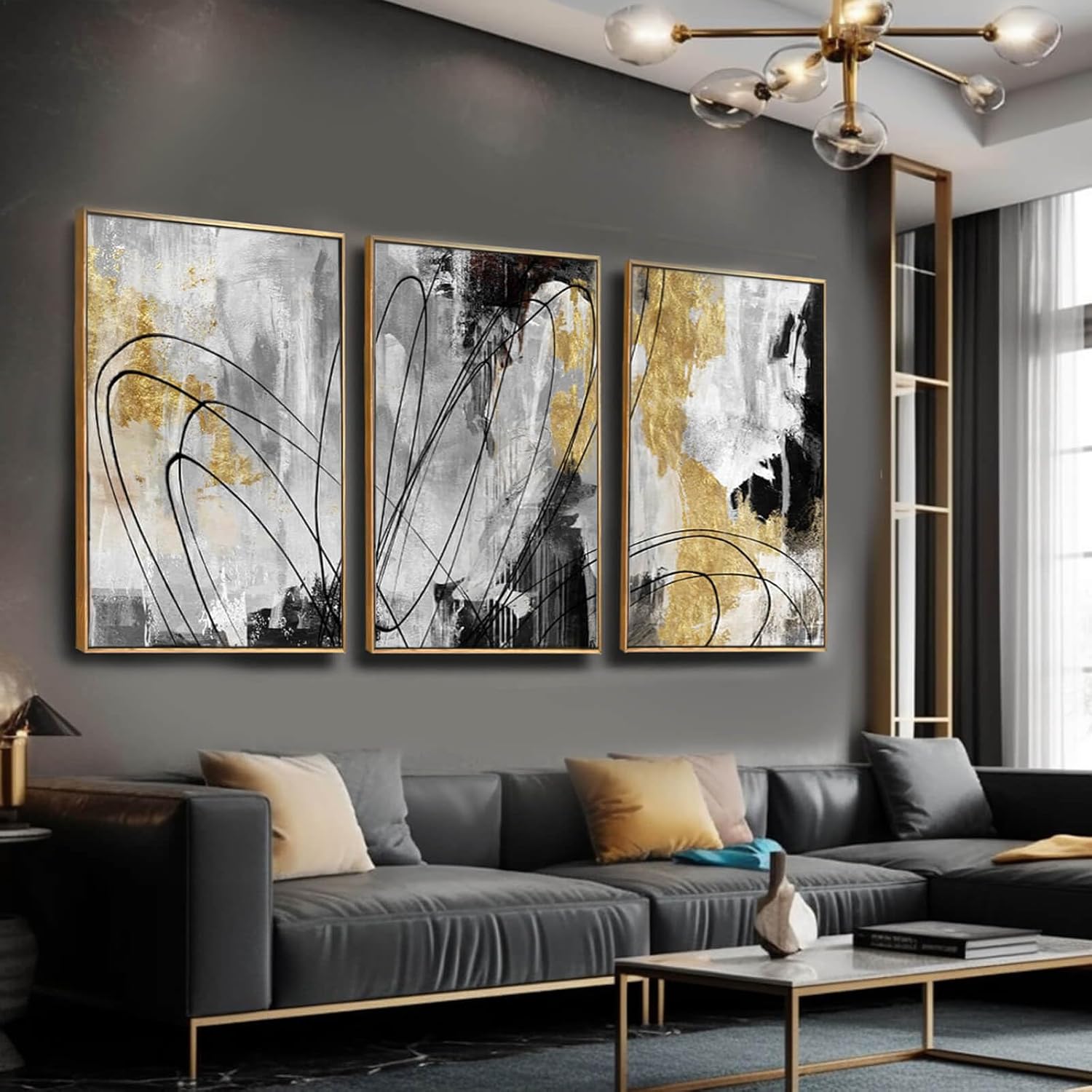 YJYart Gold Wall Art Abstract Wall Art Living Room Decor Black and White Canvas Picture Home Decor Wooden Frame Line Paintings Modern Artwork Office Decor 24"x 36"x 3 Pieces