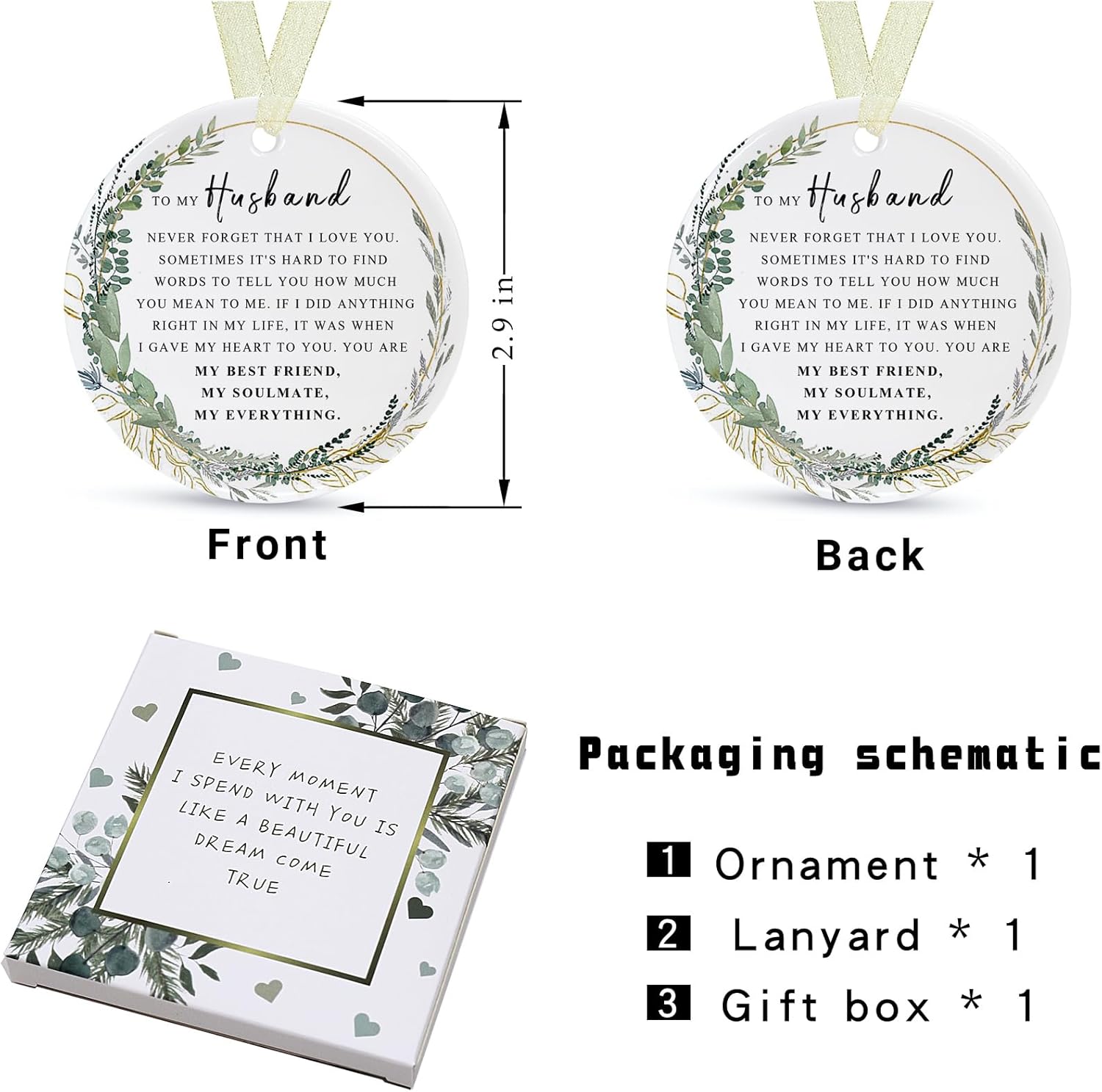 - đźăPerfect and delicate sizeăThis is a husband memory ornament with a diameter of 2.9 inches and a thickness of only 0.18 inches. The product includes: a round husband ornamentt*1, a gift box*1 and a lanyard*1. The gift box comes with it makes it easy for you to give the best husband ever gifts directly to family and friends and other special people in your life, and the lanyard that comes with it helps to hang it easily on the Christmas tree or anywhere you want.