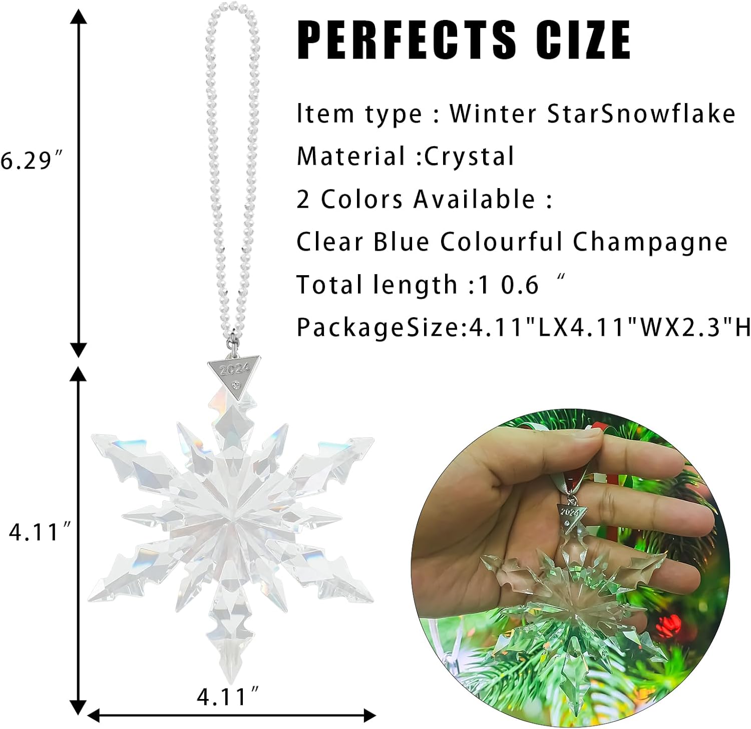 - The set includes: (13.5 cm × 8.5 cm) snowflake decoration, 3 ribbons, 1 crystal chain and 1 gift box