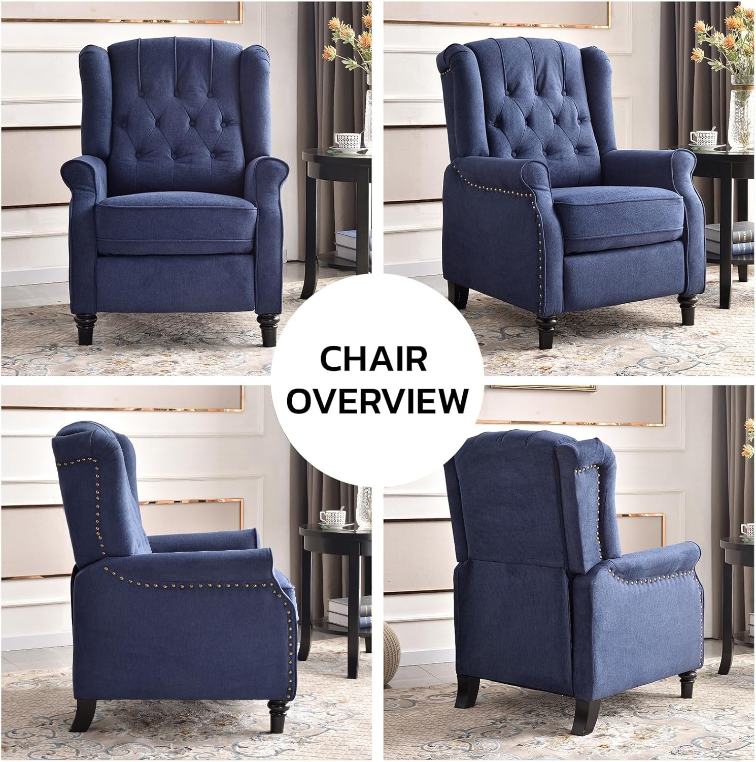 - Modern Design: With a Button-tufted Diamond Design the pushback recliner chair will brighten your living decor. And blue recliner is ideal for most kinds of the decor style. Perfect for living rooms, bedrooms, theater rooms and media rooms