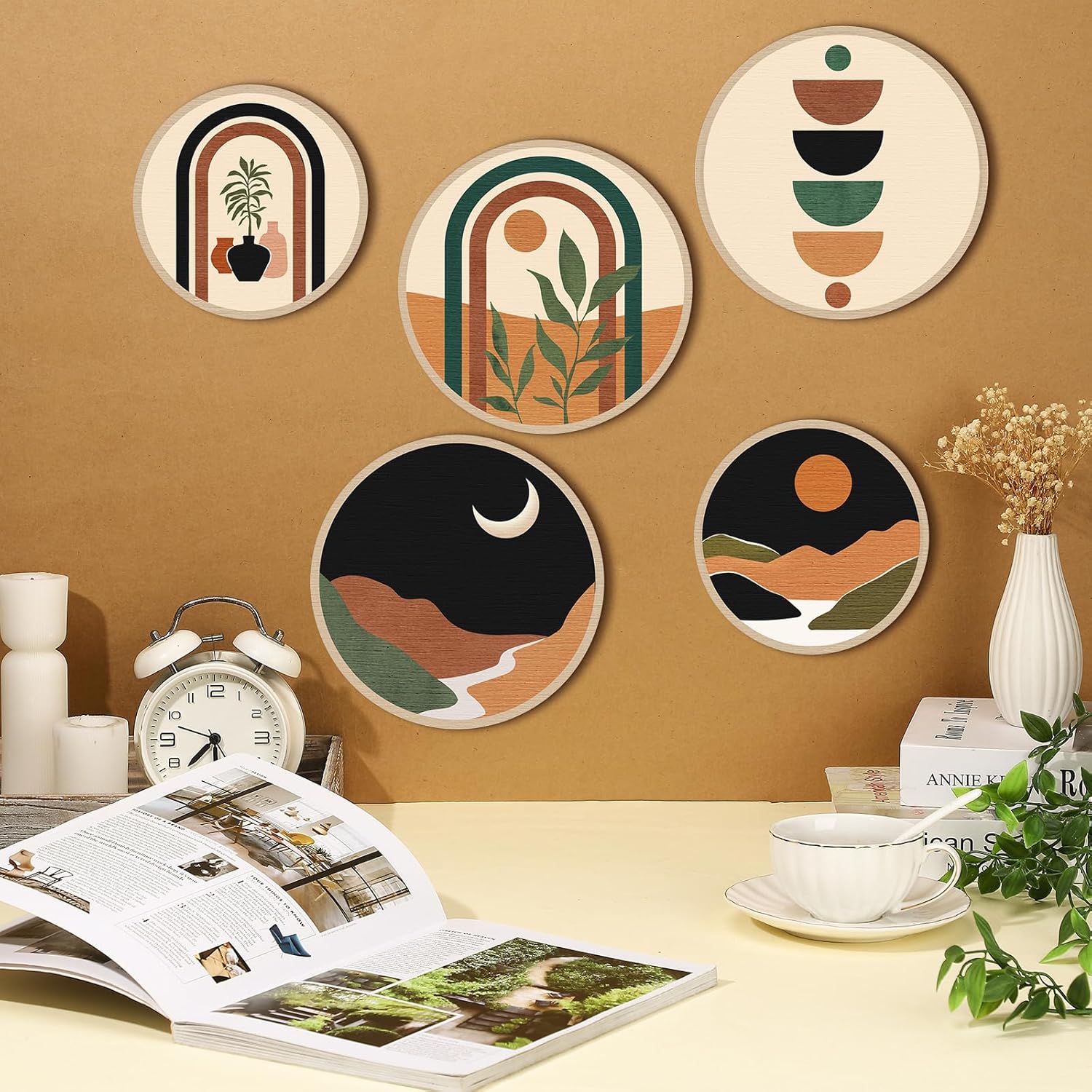 Qunclay 5 Pcs Wall Art Decor Wooden Living Room Wall Decor Bohemian Hanging Farmhouse Geometric 10'' and 8'' Aesthetic Wood Minimalist Posters for Bedroom(Sunset)