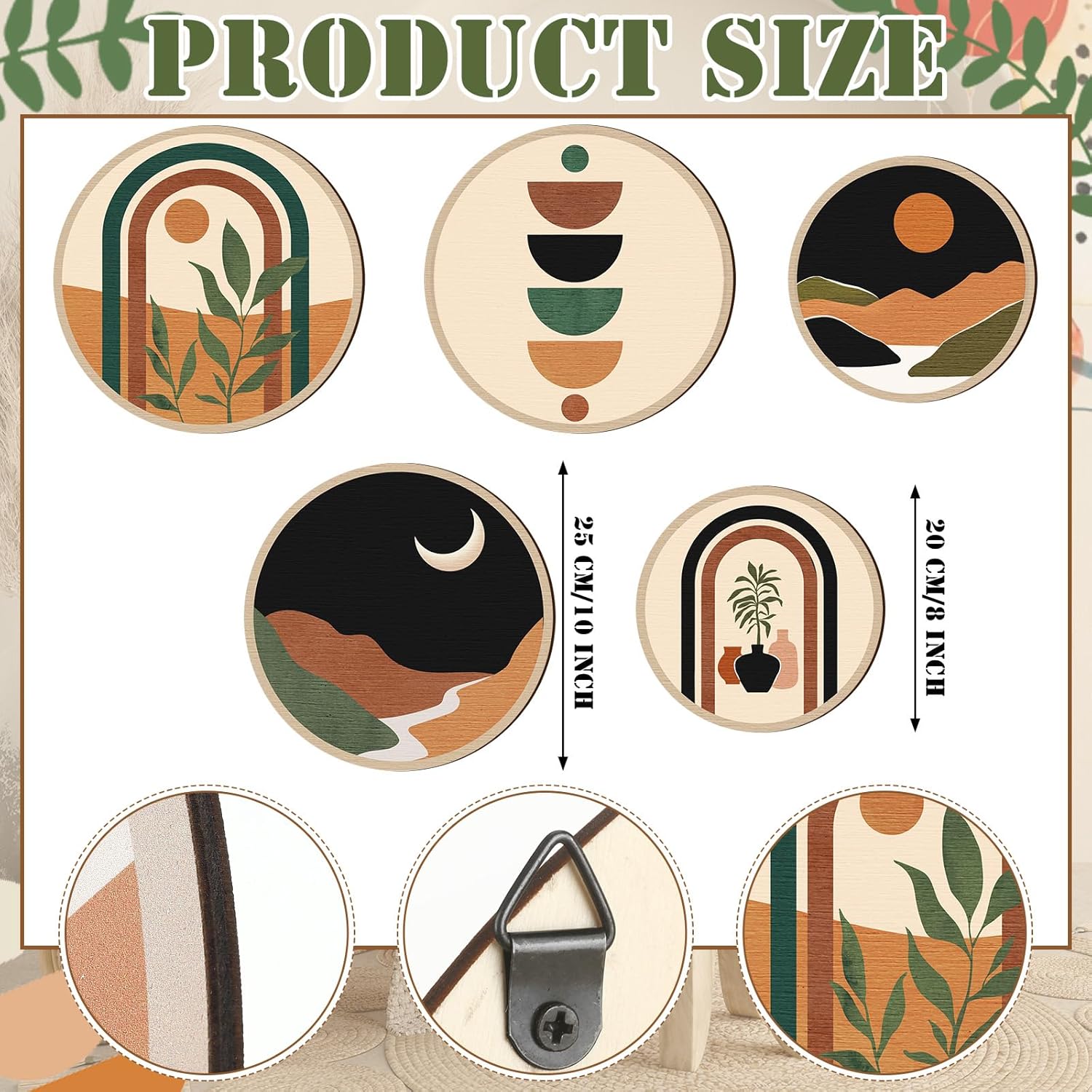 - Proper Size for Display: there are 2 kinds of sizes of the aesthetic wall art, 3 bigger ones measure about 10 inches/ 25 cm in diameter, and 2 smaller ones are about 8 inches/ 20 cm in diameter, all of them are about 0.2 inch/ 0.5 cm in thickness, proper size to catch people's attention