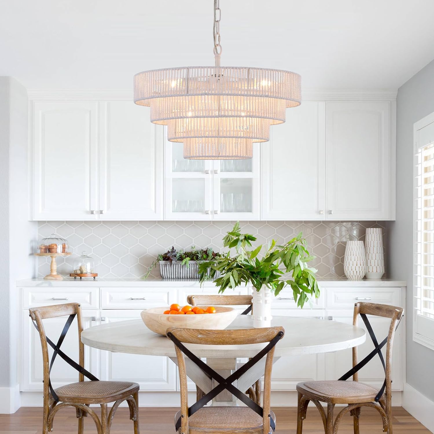 6-Lights 20" Hand-Woven Rattan Pendant Light Coastal 4 Round Transitional Minimalist Boho Large Pendant Light, for Kitchen Island Dining Room Living Room Hallway, White, UL Listed