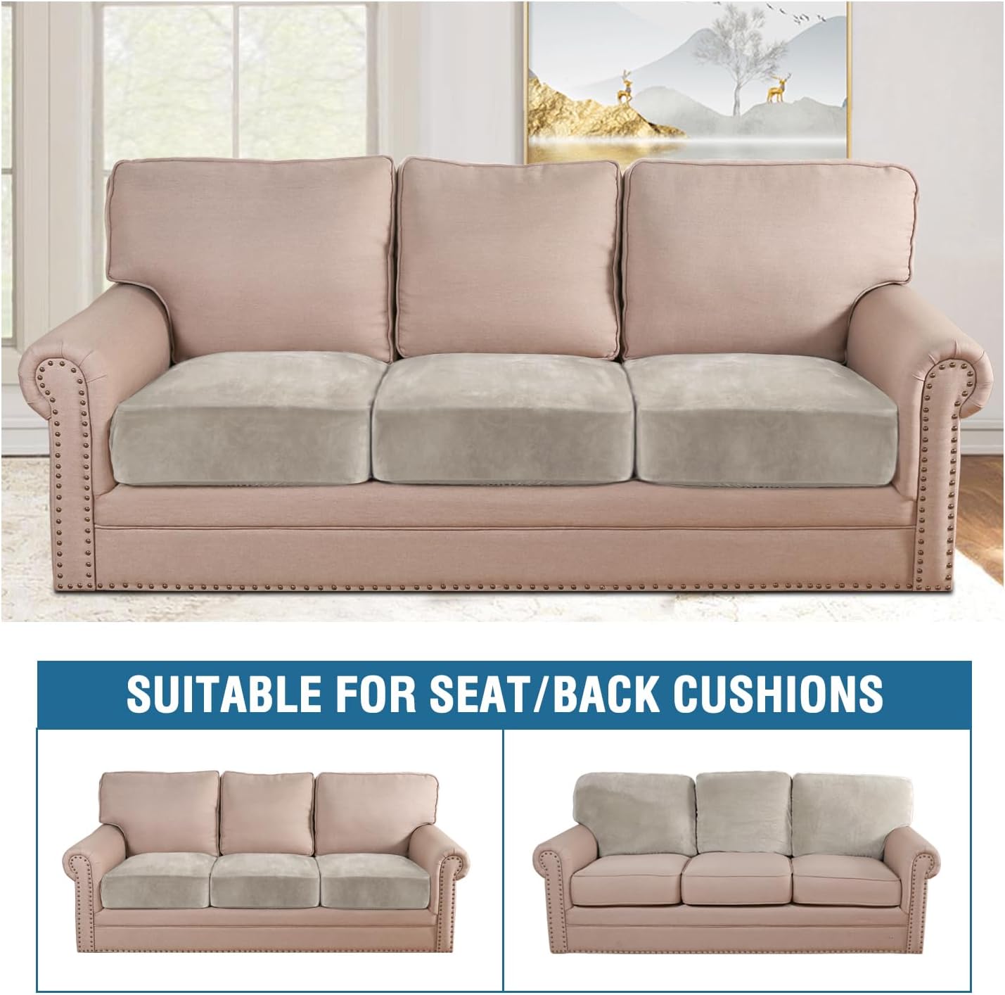 H.VERSAILTEX Velvet Stretch Couch Cushion Cover Plush Cushion Slipcover for Chair Loveseat Sofa Cushion Furniture Protector Seat Cushion Sofa Cover (3 Piece XL Sofa Cushion Covers, Oatmeal)