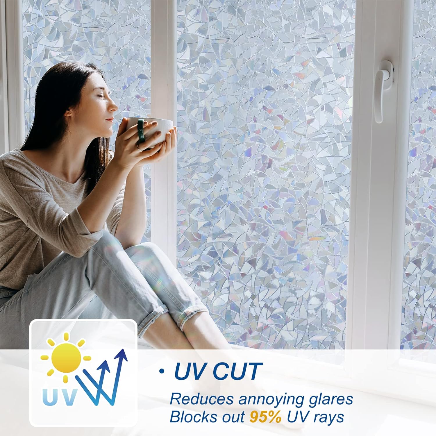 - Special Effect: Designed by grayish silver color with 3D laser process, this privacy window film will create a visual effect when the sun hits the decal. The decorative window film itself does not actually have any color. Also, it classes up the room and makes the window look like stained glass without the expense of a custom stained glass window