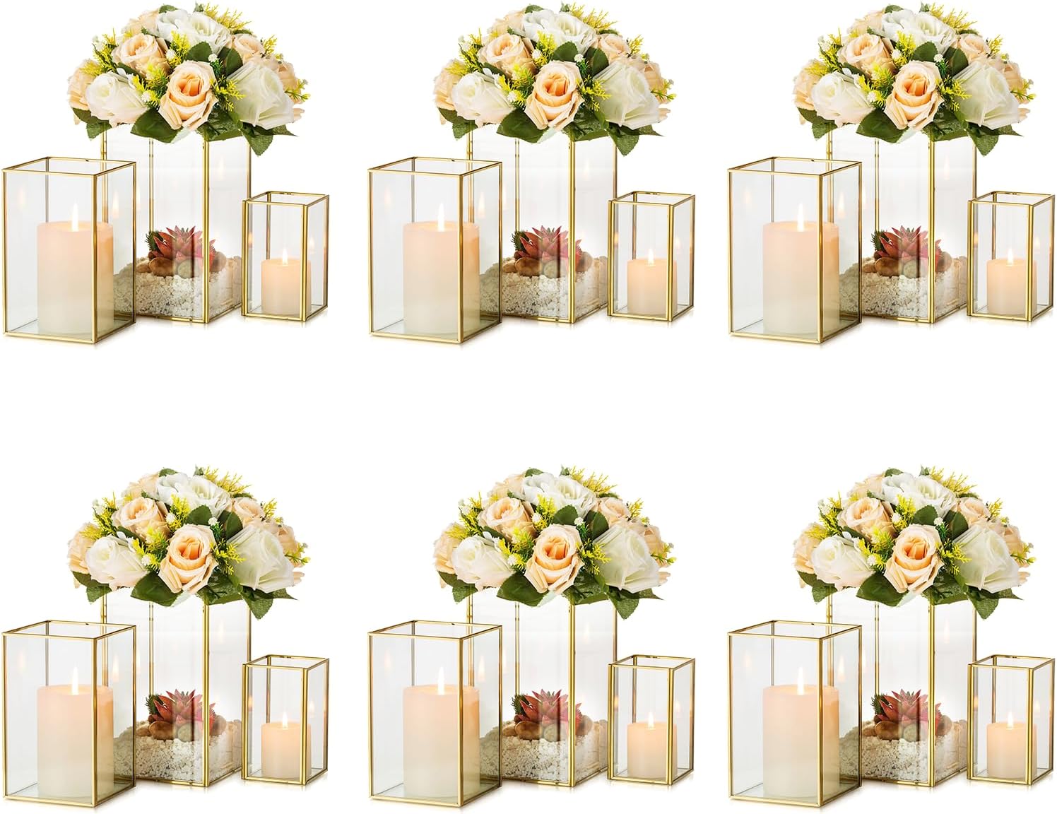 Glass Hurricane Candle Holder Large - Hewory 18pcs Gold Rectangle Flower Holders Centerpiece for Table, Tall Floor Square Pillar Candle Lantern for Wedding, Anniversary, Party, Fireplace, Dining Room