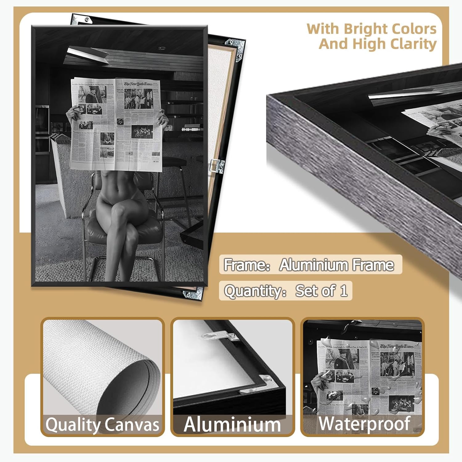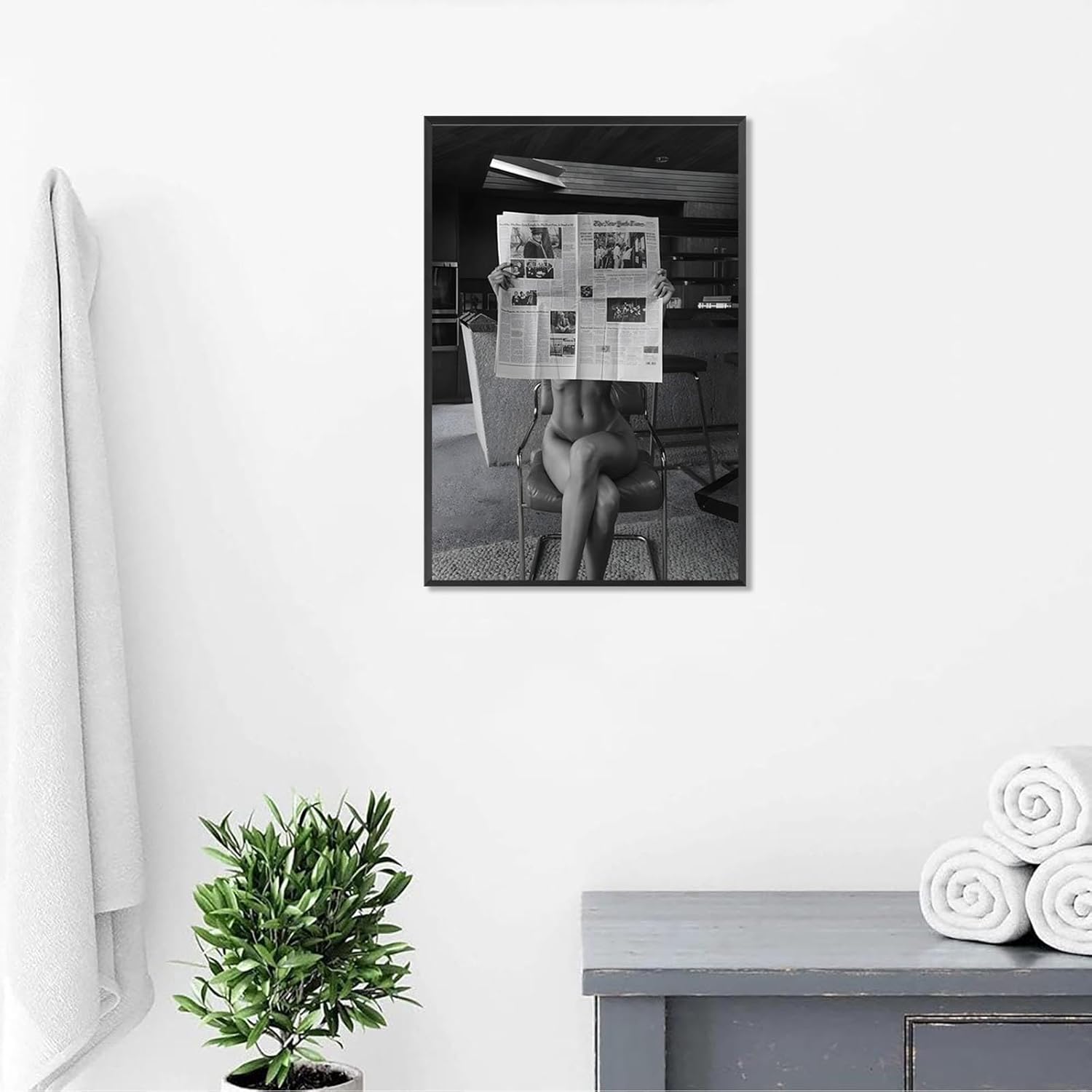Sexy Glamorous Reader Poster Feminist Art Black and White Preppy Canvas wall art Retro Room Aesthetic Newspaper prints painting Trendy Naked Women Art wall decor 16x24in Framed