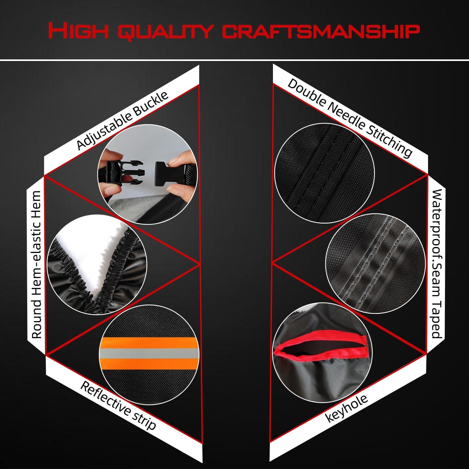Motorcycle Cover, Heavy Duty 600D Oxford, Waterproof Outdoor, Weather Resistant, Rip-Proof, Anti-UV with 5 Reflective Strips, 2 Lock-Holes, 1 Windproof Strap, 1 Storage Bag (97.5" x 41" x 50")