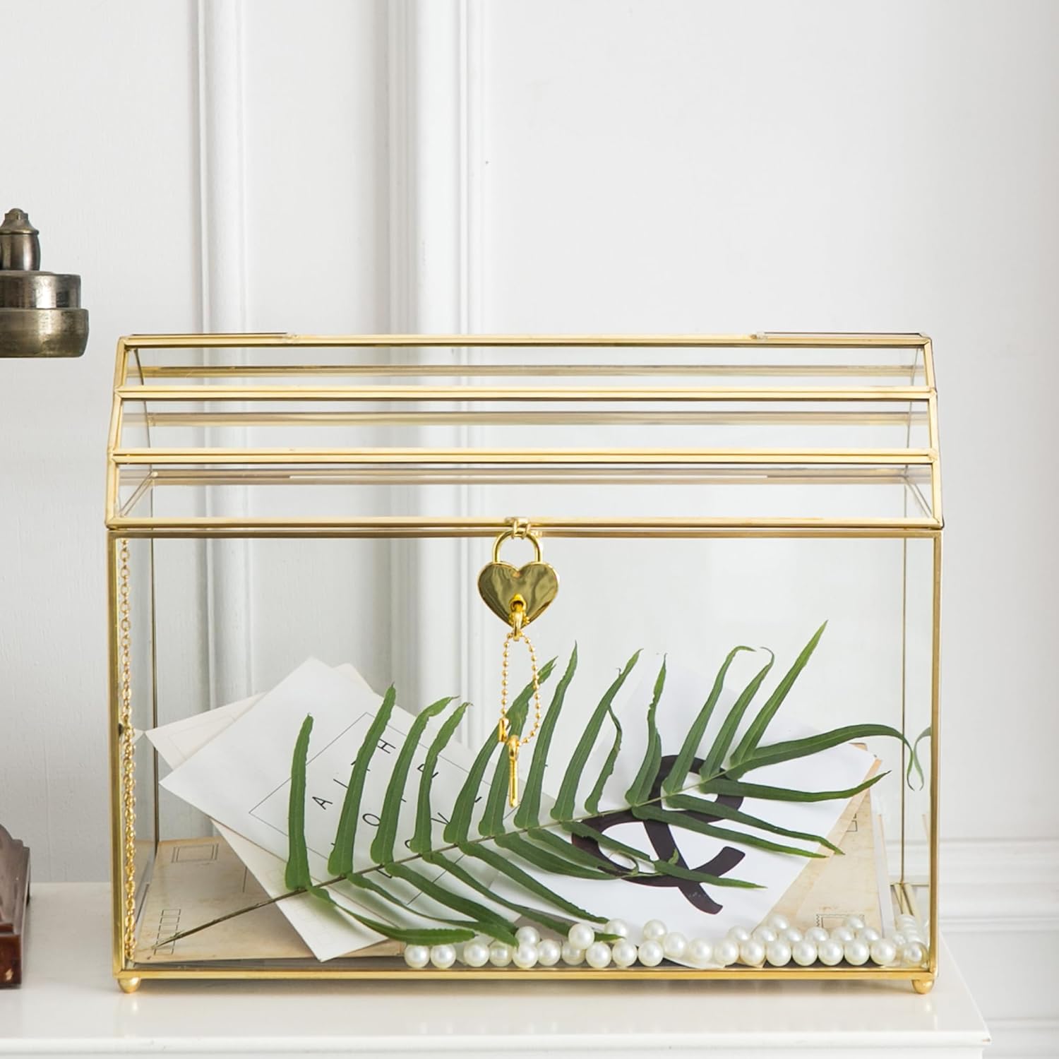 - Wedding Glass Card Box - Add a touch of elegance to your home decor with our stunning Gold Wedding Glass Card Box. Featuring a slot on the top and a lid with heart-shape lock, this glass card holder is perfect for any occasion, from weddings and parties to birthdays and more. The heart-shaped lock with key ensures safe and secure storage of your cards and other precious items.