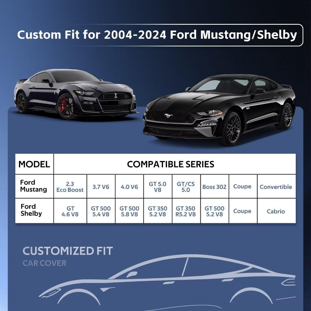 - 【Perfect Fit】— Holthly has conducted experiments to obtain a customized car cover specifically designed for Ford Mustang, Shelby, GT350, GT500 (1964-2024). The custom-like fit of the full cover not only enhances the -aesthetics of your vehicle but also provides superior wind resistance, thereby prolonging the lifespan of the hood. It offers enhanced and long-lasting protection for your car.