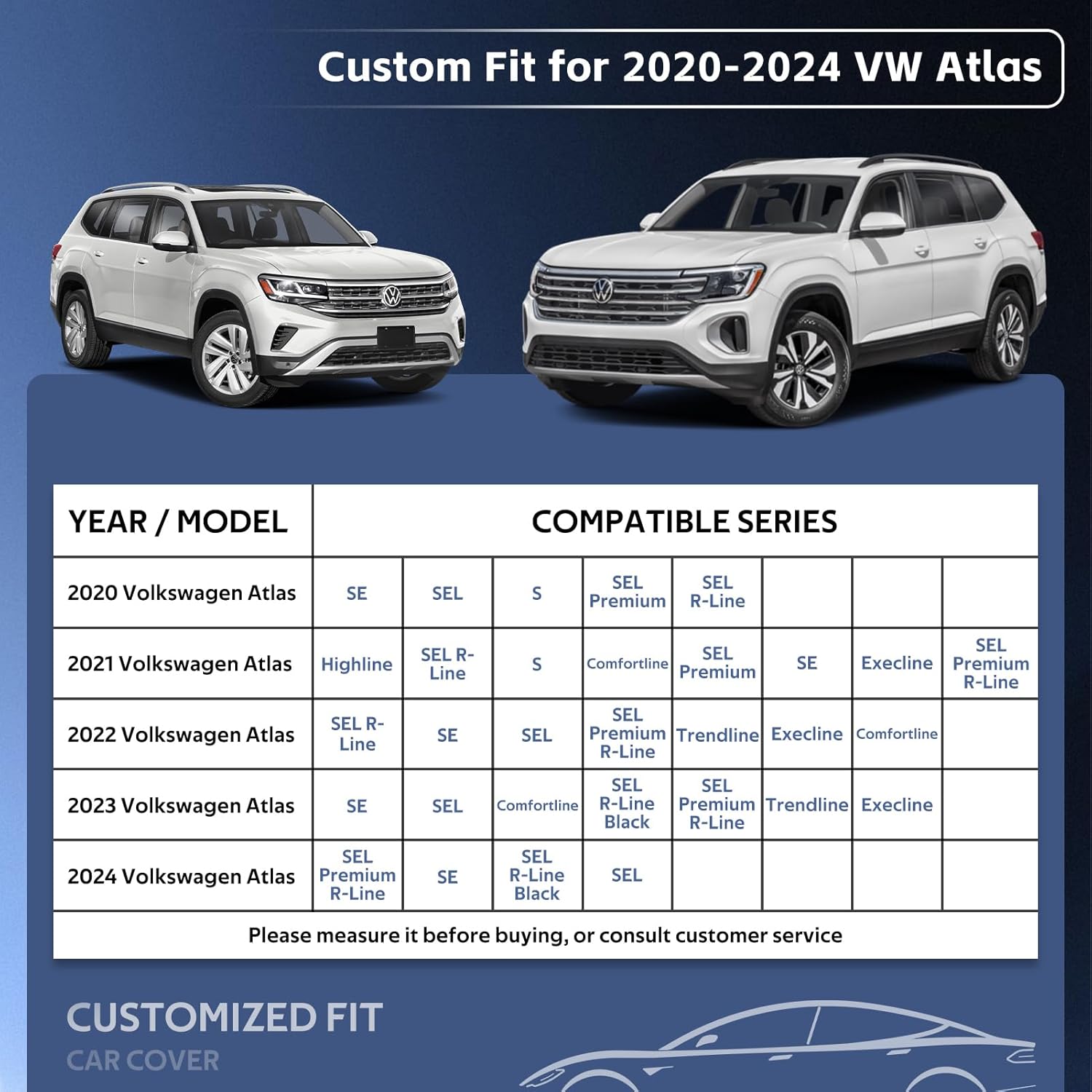 - 【Perfect Fit】— Holthly has conducted experiments to obtain a customized car cover specifically designed for Volkswagen Atlas (2017-2024). The custom-like fit of the full cover not only enhances the -aesthetics of your vehicle but also provides superior wind resistance, thereby prolonging the lifespan of the hood. It offers enhanced and long-lasting protection for your car.