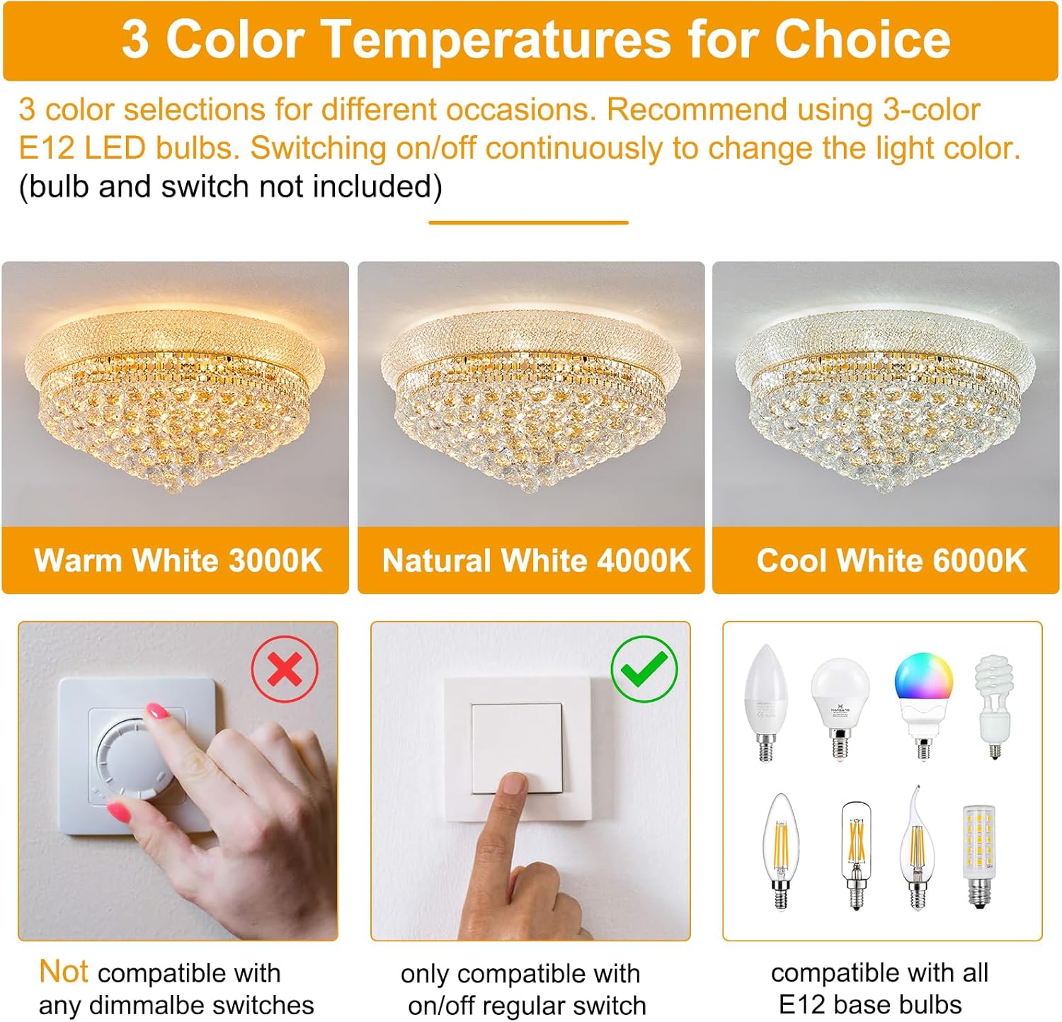 - 【Light Up Your Room】12 x E12 Bulbs (Not included) will be worked well with this empire chandelier. Recommend using 3-color LED bulbs and compatible dimmer switch (Not included). You could choose which color temperature (warm white-3000K / neutral white-4500K / daylight white-6000K) would be fit for yours rooms.