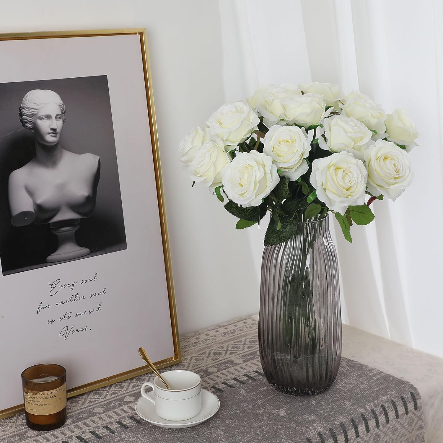 White Fake Roses Artificial Flowers - 16 Pcs Fake Artificial Roses Silk Flowers with Stems for Home Wedding Hotel Office Centerpiece Decor