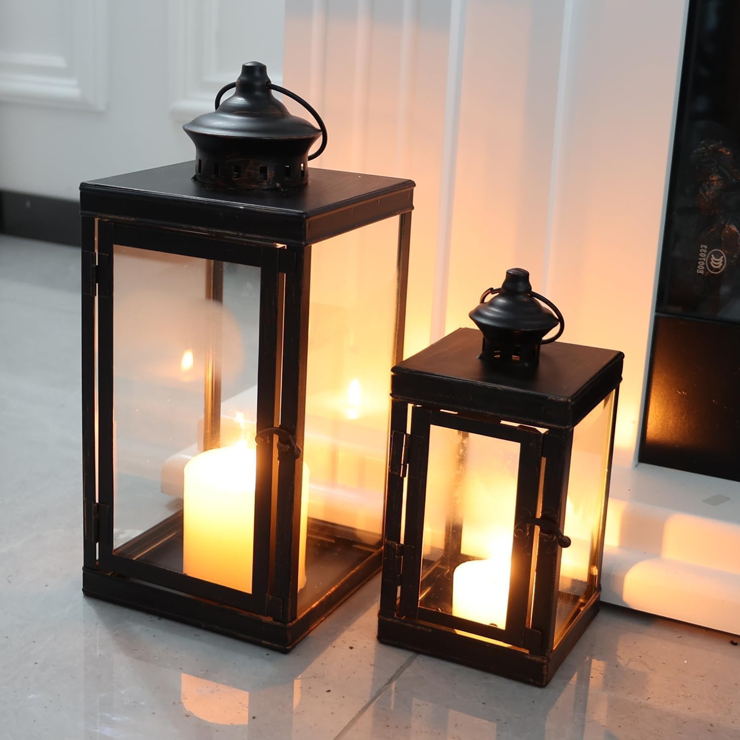 DECORKEY Large Lantern Decorative Outdoor & Indoor, Set of 2 (14’’&10’’) Metal Candle Lanterns Decor, Vintage Hanging Candle Holder for Front Porch Patio Wedding Farmhouse Home, Spring Decoration