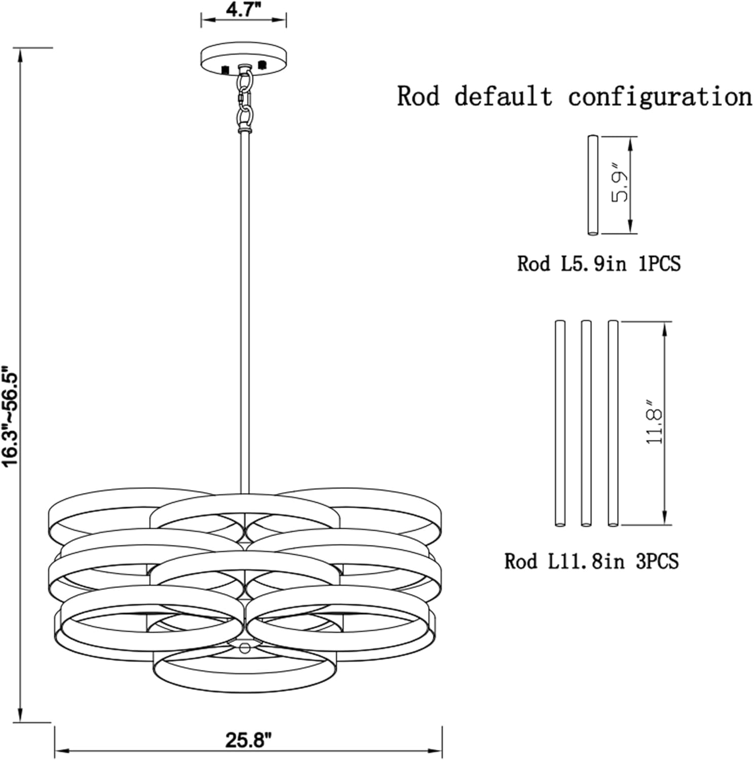 - Size & Widely Applications -- Diameter: 25.8in, Height: 16.3~56.5in. Canopy Diameter: 4.7 in. Comes with one 5.9" and three 11.8" downrods, so you can flexibly adjust the hanging height of the Industrial chandelier. Sloped ceiling adaptable.