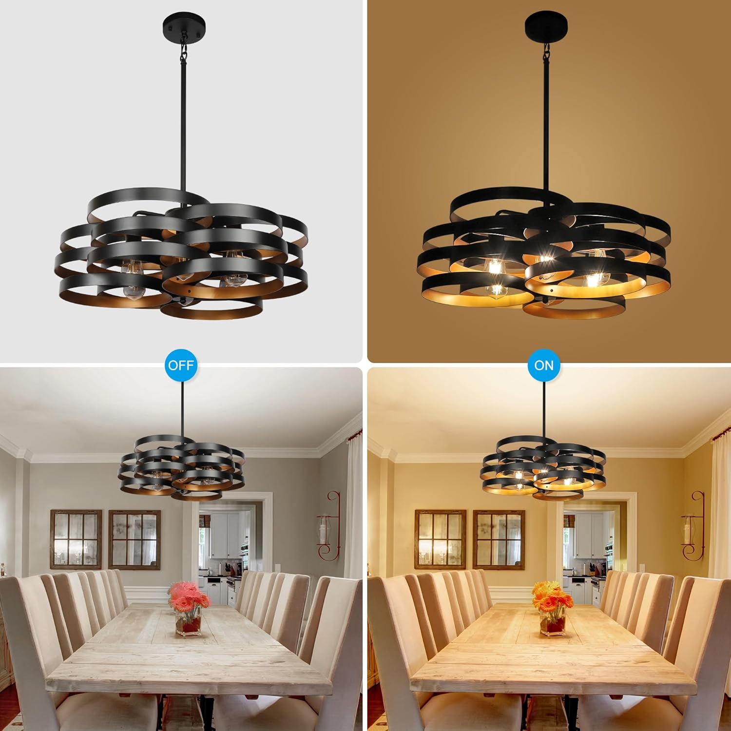 - Rustic Farmhouse Style -- Rustic chandelier was made by a skilled craftsman. The light body is composed of 18 rings black with gold interior decoration, arranged in 6 tiers to create a very unique look. The stacked rings will cast beautiful light and shadow under the irradiation of the light. The black chandelier contains 6 bulb bases that will emit a lot of light and illuminate the entire space.
